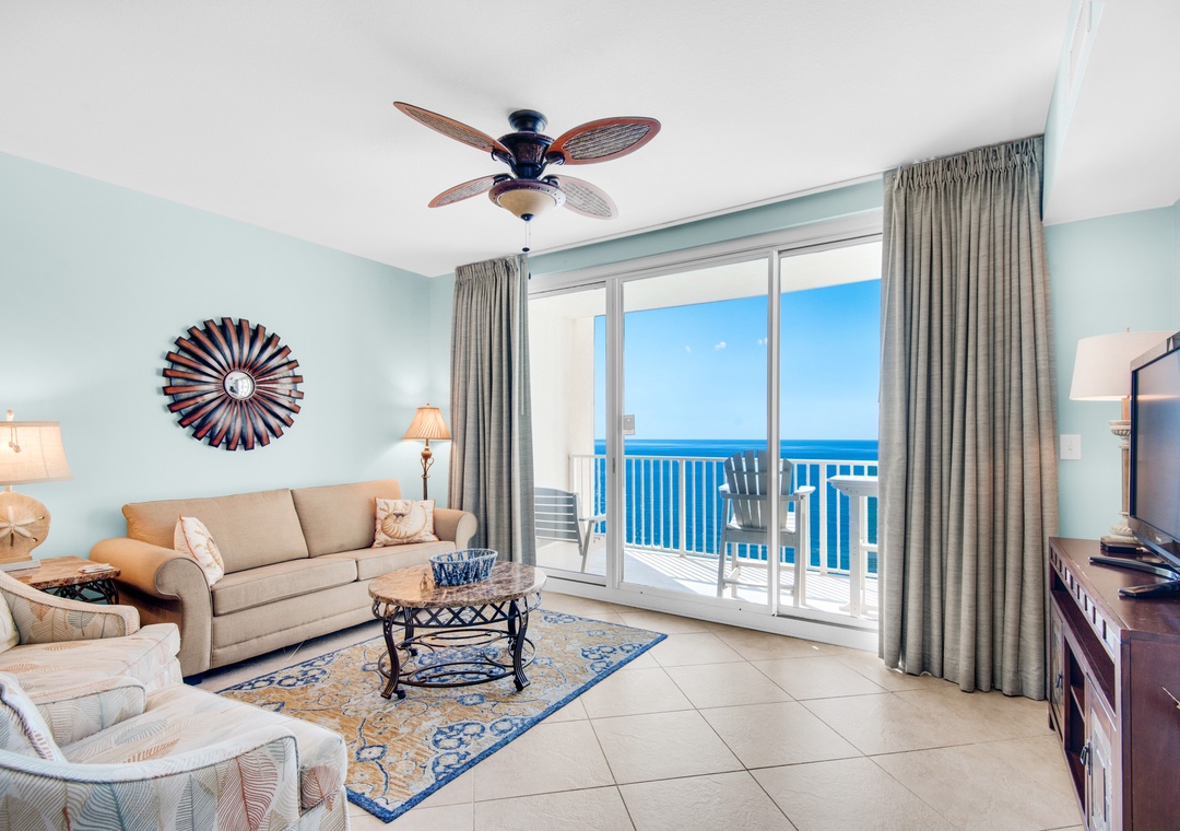 Welcome to Shores of Panama 1617. This 16th-floor beautiful 2 bed, 2 bath condo is perfect for a small family vacation or private getaway. The master bedroom offers a king bed with en suite, a bunk room which provides a twin-over-twin bunk, and an additional sleeper sofa in the living room to accommodate up to 6 guests comfortably. Enjoy the morning view while relaxing on your XL private balcony and curl up on the couch in the living room enjoying a movie after a long day on the beach. The chef will enjoy a fully equipped updated kitchen while you and the other guests unwind at the kitchen bar. For added convenience a washer and dryer are located within the condo. Come make lasting memories at Shores of Panama 1617 today.