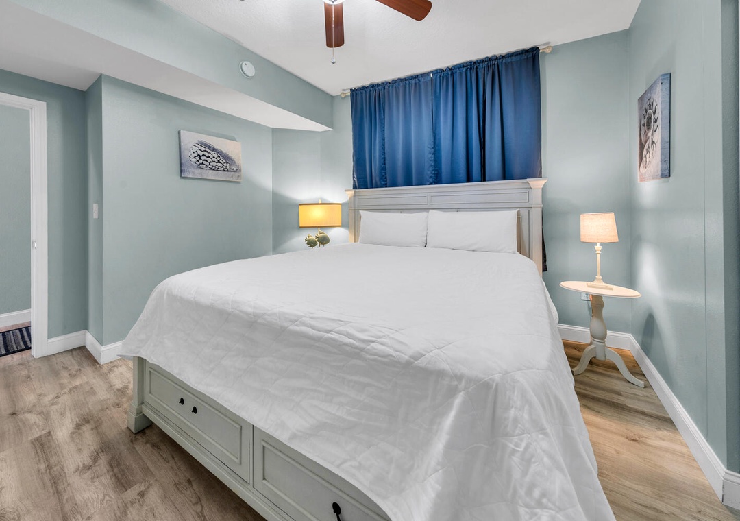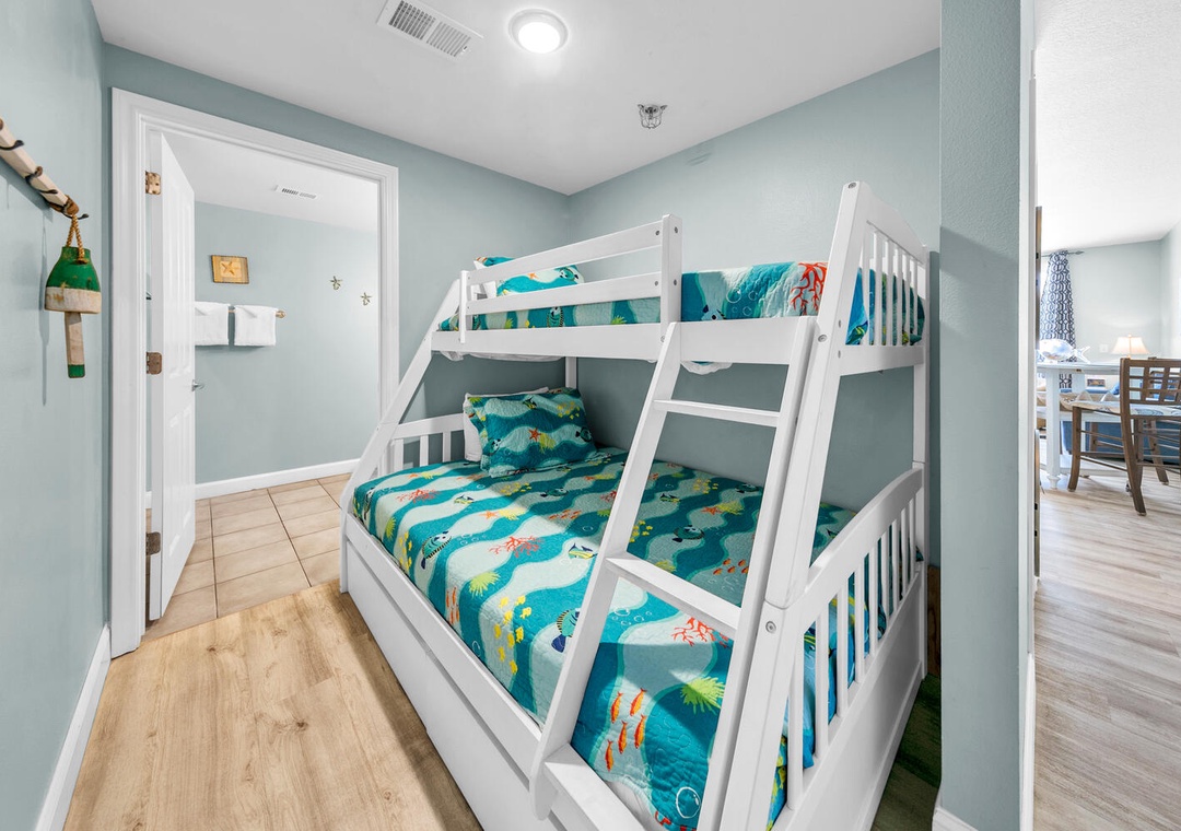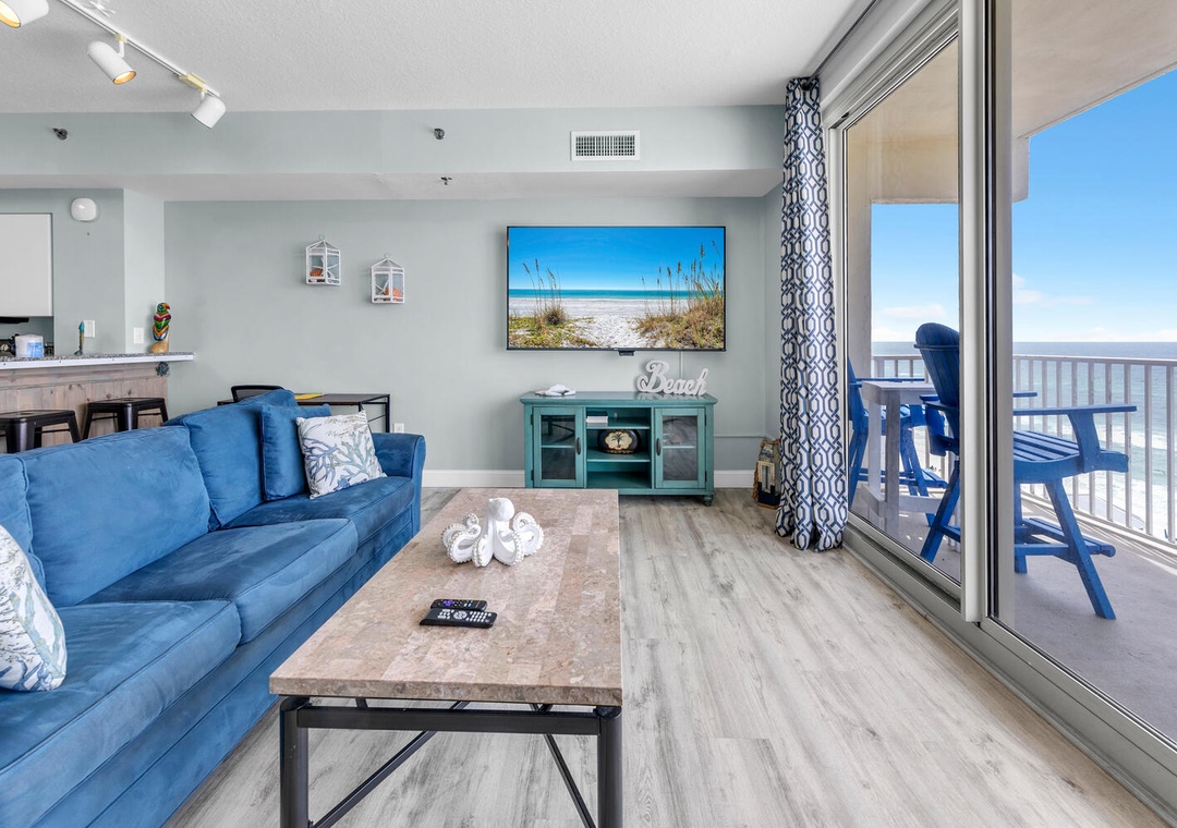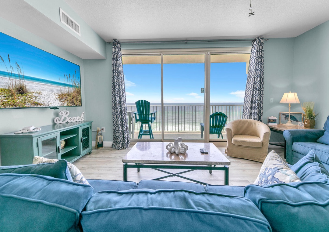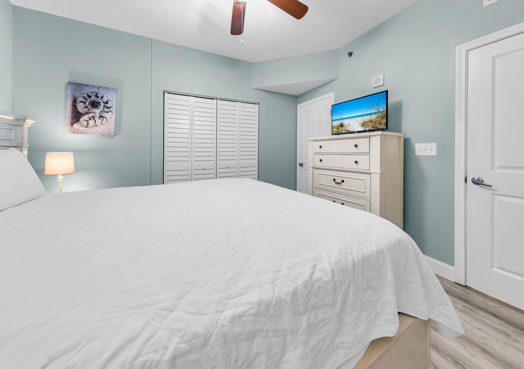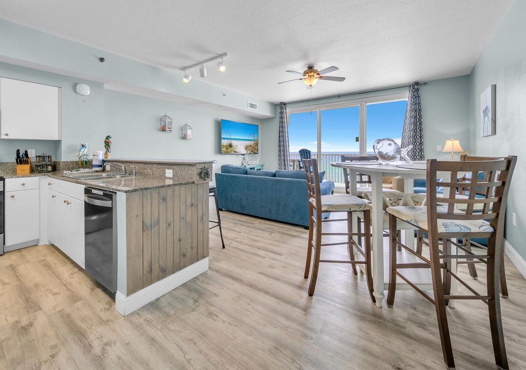 Welcome to Shores of Panama 830! This coastal chic 1 bed + Bunk room, 2 bath condo features a large balcony perfect for relaxing after a long day at the beach. Step out onto your balcony with your morning coffee to see and hear the soothing waves of the Gulf. You will not have to fight over beds in this unit, there is plenty of space for everyone. There is a king bed in the bedroom, a queen sleeper sofa in the living room, and a twin over full bunk beds in the hallway, sleeping up to 6 guests comfortably. The fully equipped kitchen is perfect for creating delicious, home-cooked meals with your family. Enjoy scrumptious meals at the dining table that seats 4 and there are also 4 bar stools at the eat in bar. You can enjoy the stunning gulf views from the comfort of the living room or enjoy your favorite movie on the flat screen TV. Bring the whole family to Shores of Panama 830 for an unforgettable vacation.