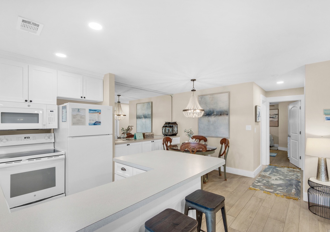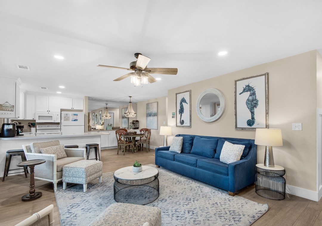 Vacation at The Salty Seahorse, Silver Dunes D206, and enjoy incredible views of the coastline and convenient location near shopping and nightlife. This gorgeous 2 bedroom, 2 bath condo features a king in the master bedroom, two queens in the guest bedroom, and a queen sleeper sofa in the living room to comfortably sleep up to 8 guests. 2021 updates in progress include new wood-like tile floors, new lighting, new paint throughout, updated wood trim and shiplap, new high-volume showerheads, new king mattress, new sleeper sofa, new bedroom furnishings, and all-white fully sanitized linens. For your convenience the unit has a Keurig and drip coffee maker, crock pot, highchair, toddler cot, and pack n' play. During season enjoy free beach service for two including an umbrella and two chairs. Parking is located outside of the condo with the elevator just steps away. There is also a coin operated laundry facility onsite for guest convenience. Book your next beach getaway at The Salty Seahorse.