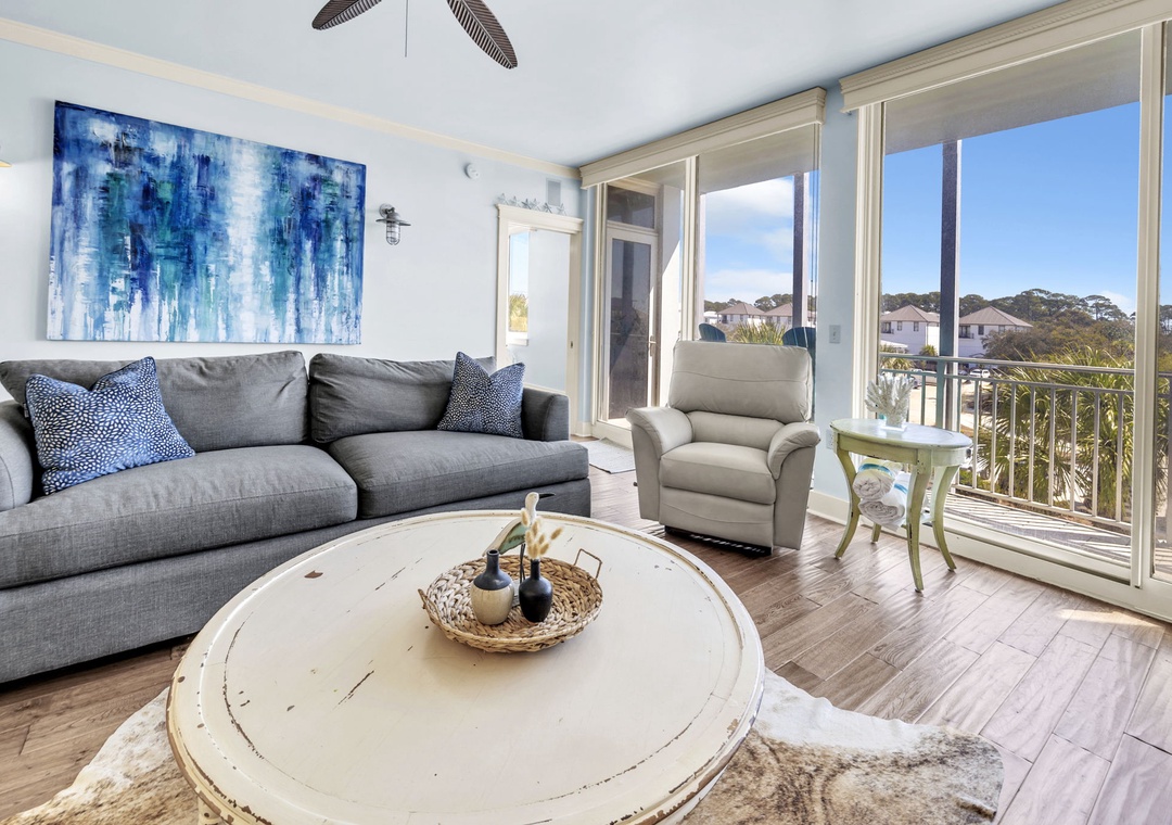 Welcome to Salty’s Six Palms 3A, a charming coastal condo nestled in the heart of Gulf Place. This thoughtfully designed 2-bedroom, 2-bath getaway comfortably accommodates guests with a king bed in the master suite, a queen bed in the guest room, and a queen sleeper sofa in the living area—perfect for families or small groups seeking both comfort and style. Take in sweeping, unobstructed Gulf views from both the master bedroom and living room, each opening onto a spacious covered balcony just 150 yards from the shoreline. Start your day with coffee at sunrise or relax in the evening as the sounds of live music from Shunk Gulley Oyster Bar float through the air. The fully equipped kitchen makes preparing beach-day breakfasts or fresh seafood dinners a breeze. As a guest of Gulf Place, you’ll enjoy access to three community pools, tennis courts, charming local shops, popular restaurants, and the iconic sugar-white sands of the Emerald Coast—all within easy walking distance. Salty’s Six Palms 3A offers the perfect blend of location, views, and laid-back beach living for your next unforgettable escape.
