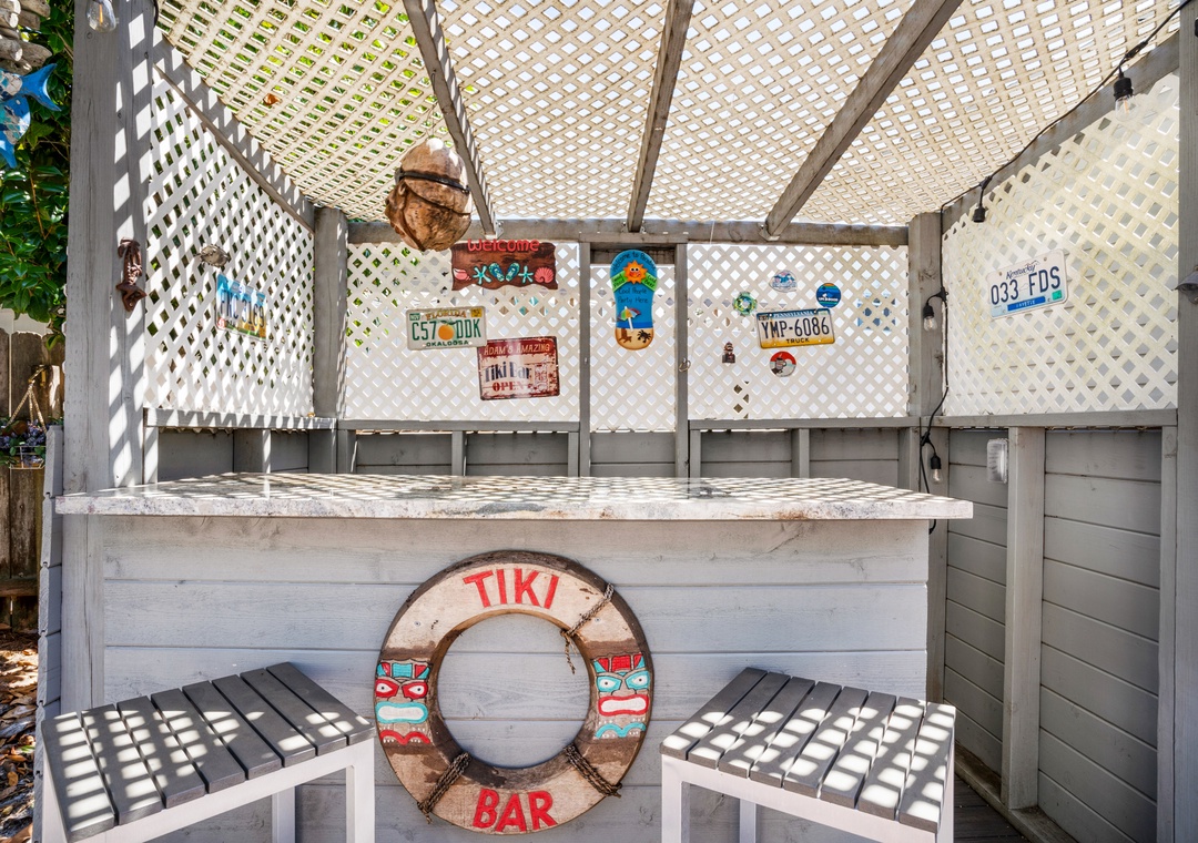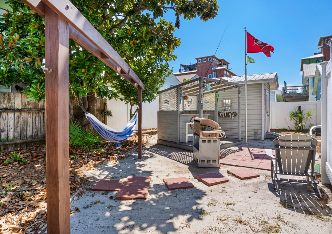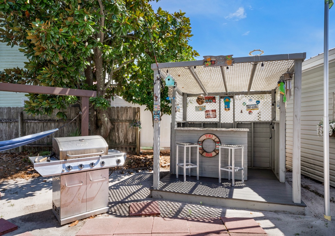 * Fenced-in Backyard with Hammock, Grill, and Bar Area