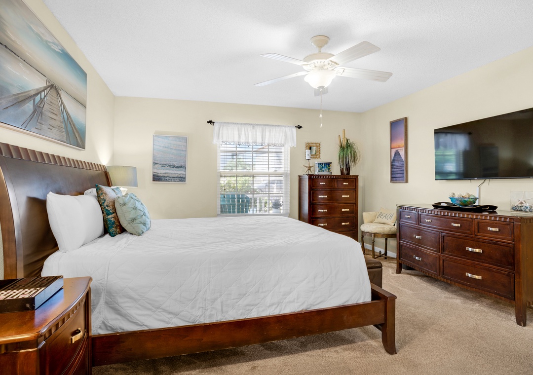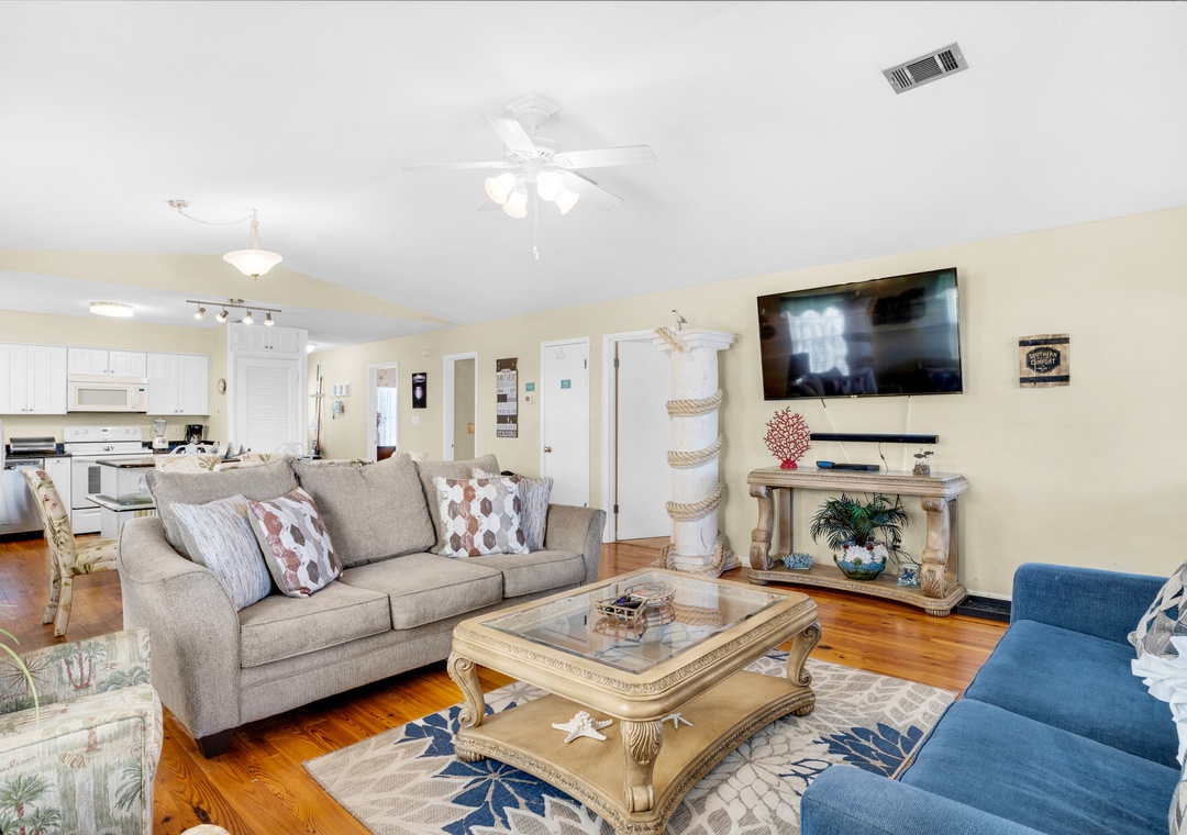 Located only 500 yards to gated beach access in Frangista Beach, Southern Comfort is a 3BR, 2BA beautifully furnished home complete with a large front porch and a fenced-in backyard oasis with a hammock, grill, and a bar area! The open concept living area features hardwood flooring and a fully equipped kitchen with a dining area and kitchen island. There’s a king master suite with a private bathroom plus an antique vanity and mirror. Additionally, there is a guest room with a queen bed, a twin bunk room, and the living room has a sleeper sofa, sleeping up to 8 guests. As an added bonus, all bedrooms and the living room have wall-mounted flatscreen TVs! When you're not enjoying the easy beach access, read a book in the hammock, grill up your fresh catch, or chill in a rocking chair on the front porch. Come see why Southern Comfort is the perfect place for a gathering of family and friends!
