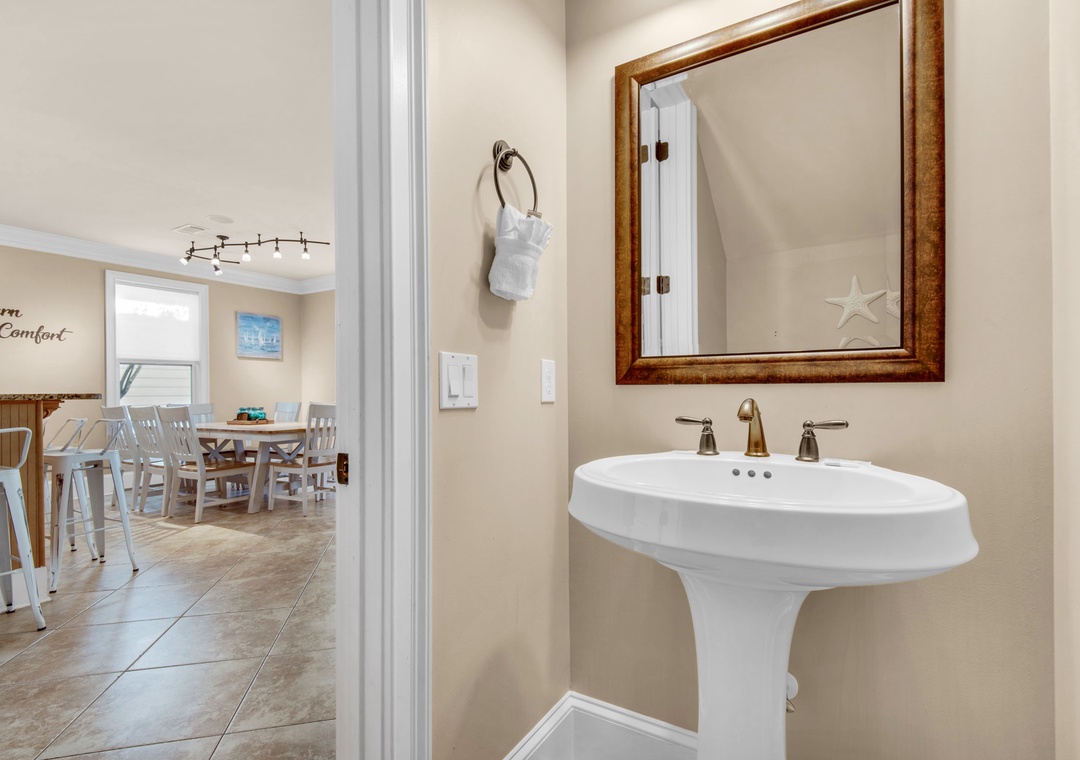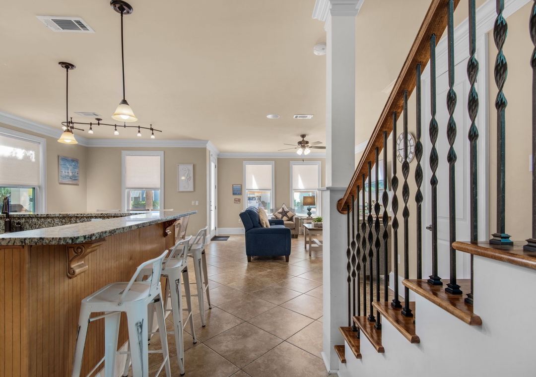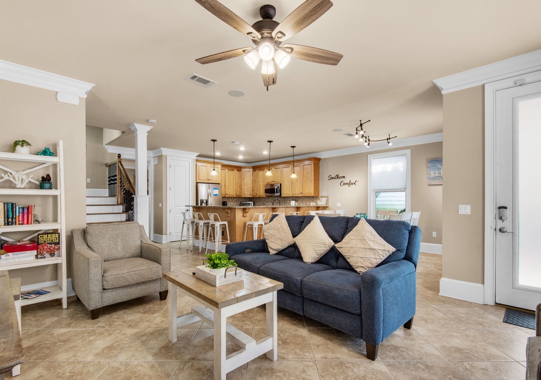 Southern Comfort VCB is a vibrant, bright home in Villages of Crystal Beach that boasts lovely floors, a gorgeous kitchen, and a secure neighborhood with an incredible lagoon pool. This 4-bedroom, 3.5 bath home sleeps up to 12 guests. The master bedroom is on the first floor with a king bed, and the private master bath features a step in shower. Upstairs there is a king bedroom, a queen bedroom, and a guest bedroom with two twin over full bunk beds, and a queen sleeper sofa in the living room. The kitchen bar features seating for 11, and the dining room table features seating for 8. The kitchen will have everything you need to prepare a family dinner. Enjoy sitting out with a cup of coffee on your tiled covered porch on the 2nd floor overlooking the beautiful landscaping of the complex. Find everything you need for a fantastic beach vacation in this lovely home in a neighborhood about 900 yards from Crystal Beach. Enjoy your next vacation getaway at Southern Comfort VCB!