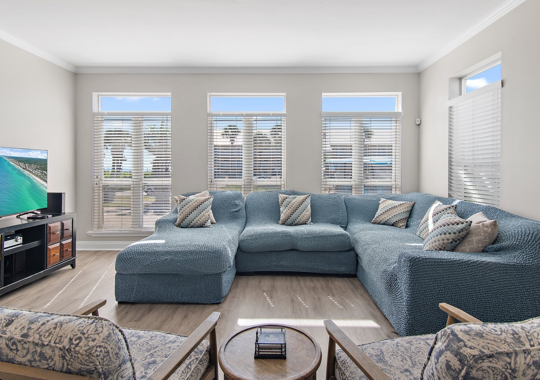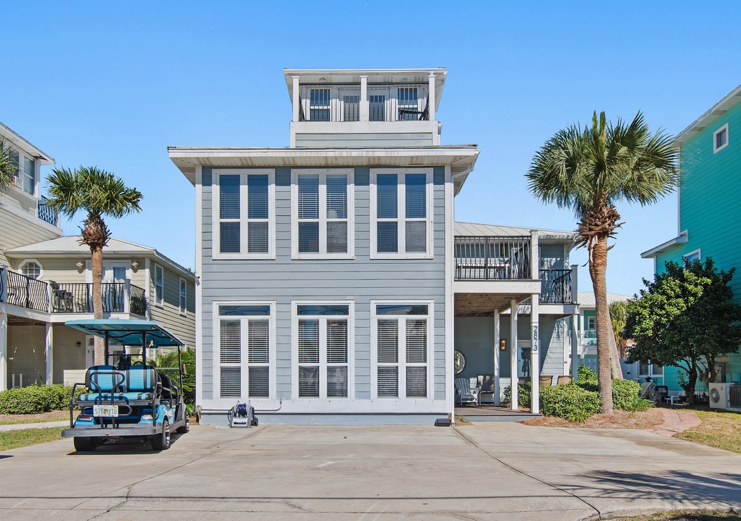 Welcome to Splash! This stunning 6-bedroom, 5.5-bath coastal retreat features a private pool and carriage house, just steps from the sugar-white sands of the Gulf of Mexico. Enjoy Gulf views and beach access right across the street. Inside, you'll find upscale touches throughout. The open kitchen connects seamlessly to the living area, and the third-story widow’s watch offers breathtaking 360° views. The main house features a first-floor king master suite, two additional king suites upstairs with balconies, and a fun bunk room for kids. The separate pool house includes a king suite, a bunk room, and a cozy living area with a sleeper sofa—perfect for extended family or friends. With space for up to 16 guests, Splash is ideal for large families or group getaways. After the beach, relax by the pool, dine outdoors, or grill up fresh seafood. A complimentary 6-seater golf cart makes it easy to explore nearby beaches, shops, and attractions. Your dream beach vacation starts at Splash!