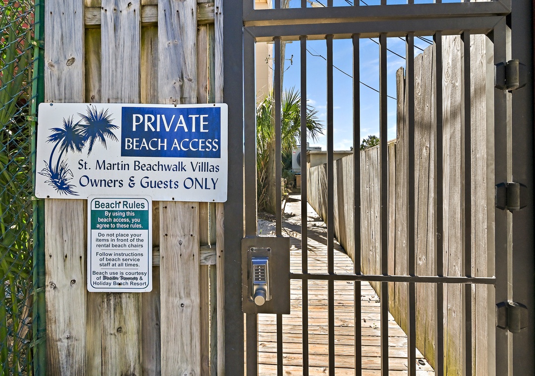 St. Martin Beachwalk Villas has a deeded beach access down your own private walkway. You do not have to cross Highway 98 to get to the sugar white sands and emerald green waters of the Gulf. The 3-story, low-rise complex is centrally located in Destin, so you can leave the car parked all week and enjoy the community pool, grilling area, proximity to Big Kahuna's water park, shopping, restaurants, and more! You can't beat the convenience and affordability of St. Martin Beachwalk Villas! Please note, this complex does not have an elevator.