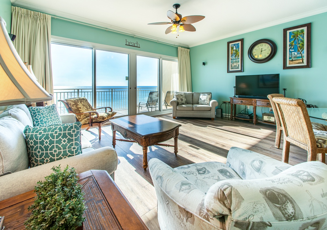 Family of 5 stayed in April. The view from our balcony and master bedroom was amazing! The condo was clean. Furniture in the living room has seen better days. The couch and chair were very uncomfortable but the beds were very comfortable. Couple of things I wish I had known about the condo. Most places I've stayed so far through VRBO have been fully stocked in the kitchen (maybe I've just been lucky). This kitchen only had the basics so bring your favorite spices if you are planning to cook. They did provide a starter pack of dish soap/dish washer soap but no laundry detergent. The grounds are kept spotless. The pool was heated and such a treat since the water was too cold to swim in April when we visited. There's a hot tub that was kept a bit too hot for us but was nice on a cool night. The beach was quite, beautiful and clean. It is far away from the crowded area down the beach. The condo does not come with beach chairs but you can rent them if you like. Favorite places to eat were Gypsea Crepes, and Sisters of the Sea. There are so many things to do in Panama city beach, minigolf, rent a boat, fishing, shopping, and tons of restaurants. Great place for families.- Reviewed On: 5/12/2022