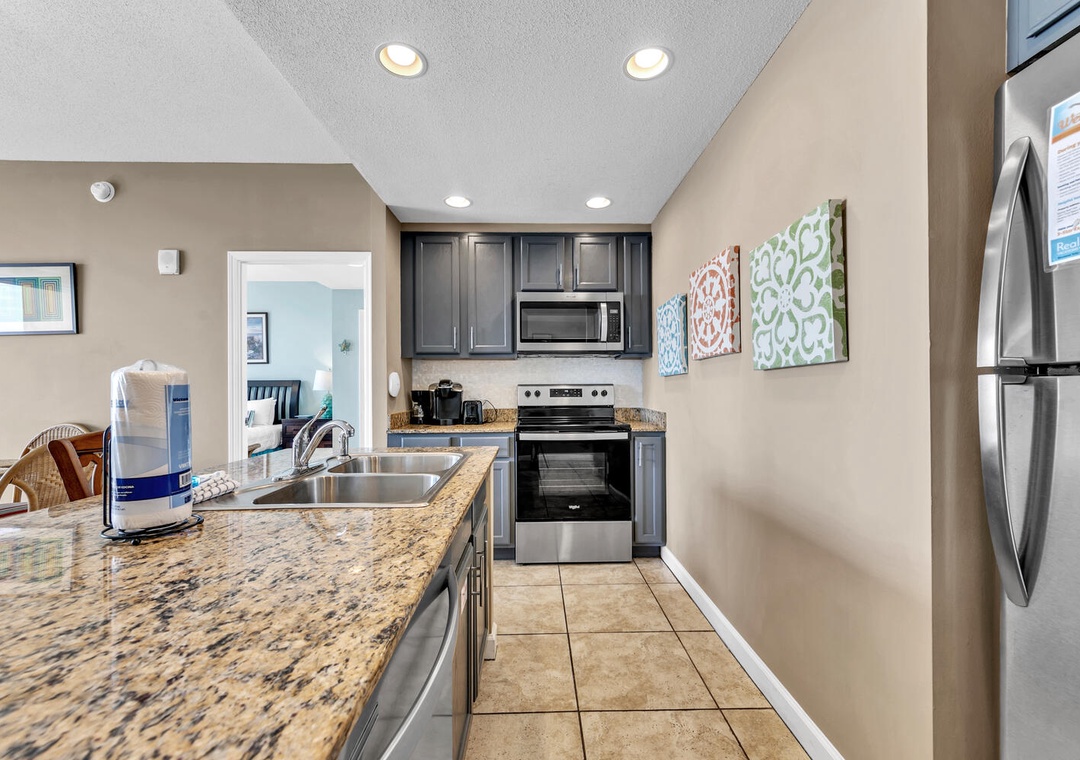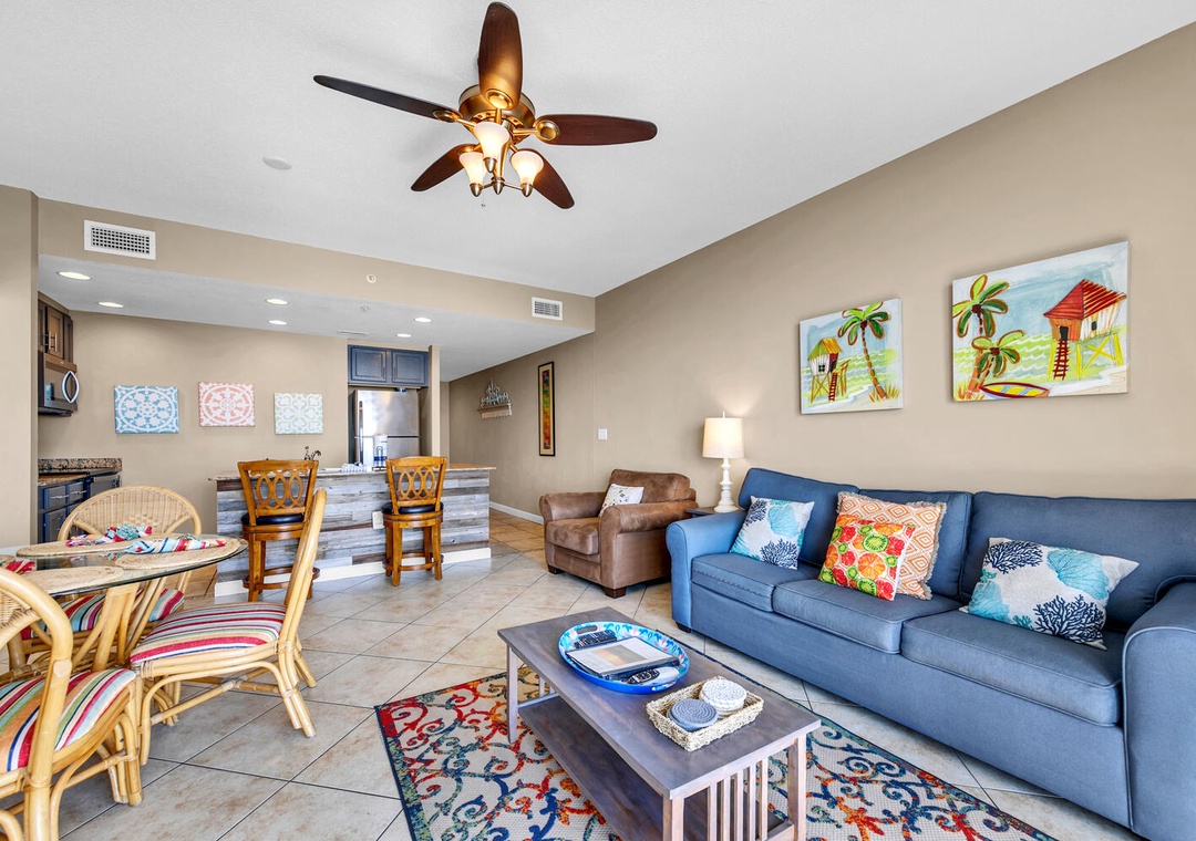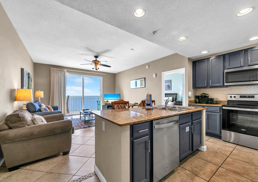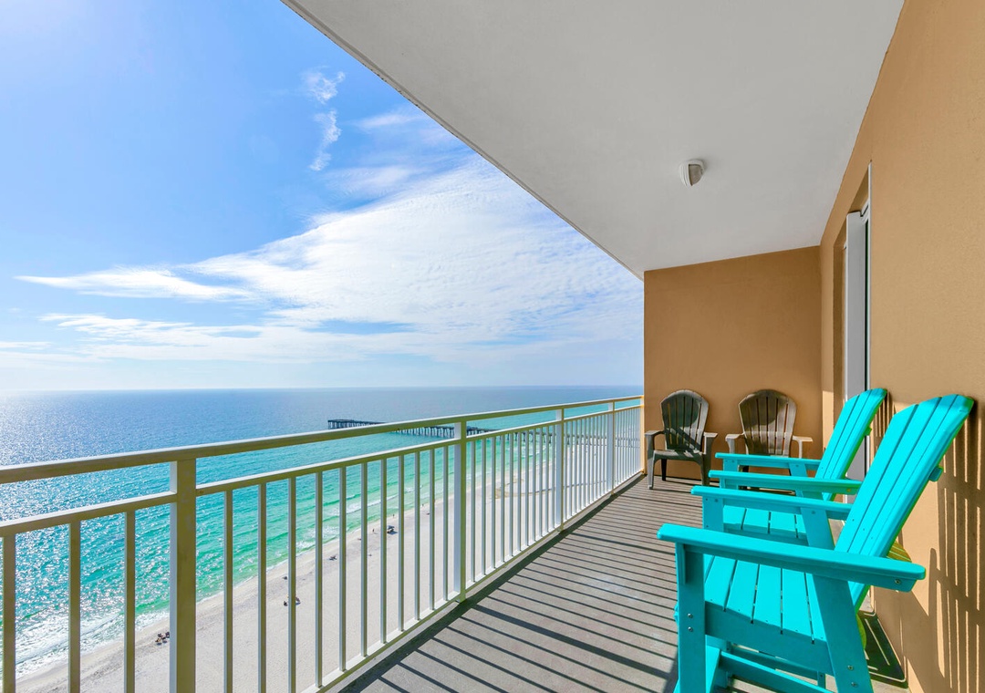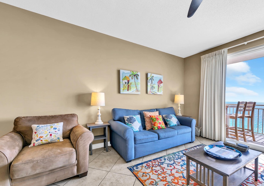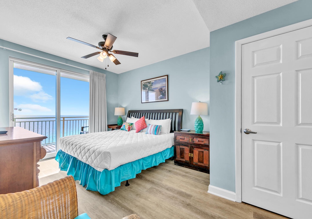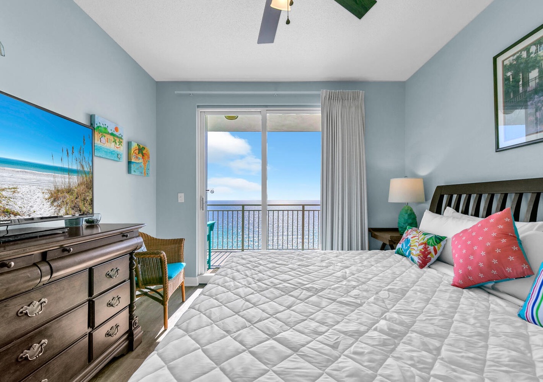 Indulge in the ultimate beachfront experience with Sterling Reef 1404, a beautifully decorated 2BR/2BA condo perched right on the sugar-white sands of Panama City Beach. This stunning condo offers unparalleled Gulf Views from your large, private balcony, as well as from the living room, kitchen, and master bedroom, so you can bask in the beauty of the emerald waters from every angle. Unwind in the cozy master bedroom featuring a plush king-size bed and balcony access, perfect for savoring the breathtaking views over your morning coffee. The guest room offers a comfortable queen-size bed, while the sleeper sofa in the living room provides additional sleeping space for up to 6 guests.