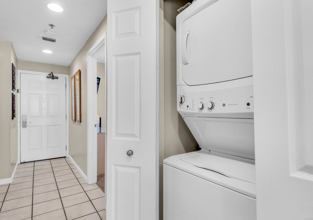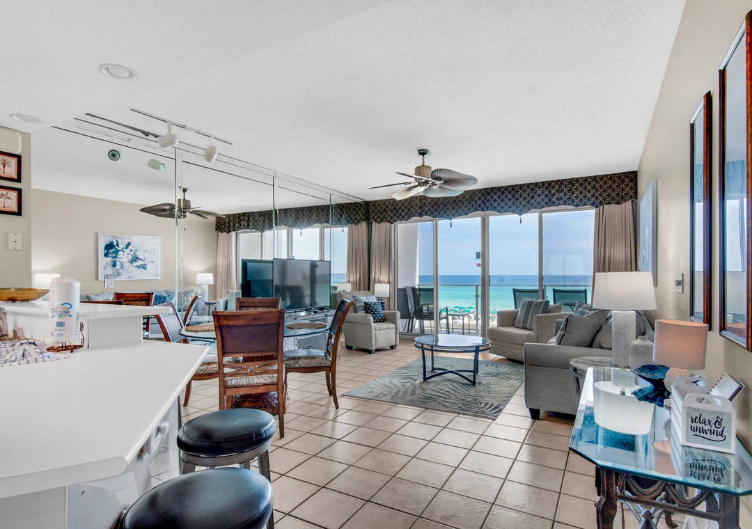 Welcome to Sterling Sands 208! This 2BR/2BA gulf front condo is located right in the heart of Destin! The wall-to-wall gulf views and ocean front pool views from the living room cannot be beat. There's a fully equipped kitchen with stainless steel appliances, a dining table for 4, and 4 barstools for extra seating at the breakfast bar. The master suite has a king bed, wall-mounted flat-screen TV, and a private bath with a jetted tub/shower combination. There's also a guest room with a queen bed and a queen sleeper sofa in the living room. Max occupancy is 4. For your convenience, there is a new stackable washer and dryer in the unit as well as your own assigned parking space. Watch the sunset and listen to the waves crash as you enjoy the spacious balcony. When you're not catching the sun on the beach, splash around in the pool or explore all the amazing amenities at Sterling Sands! Have a vacation to remember at Sterling Sands 208!
