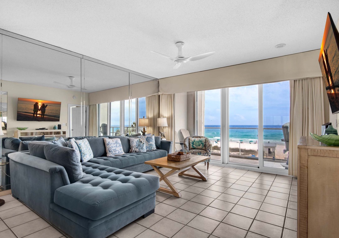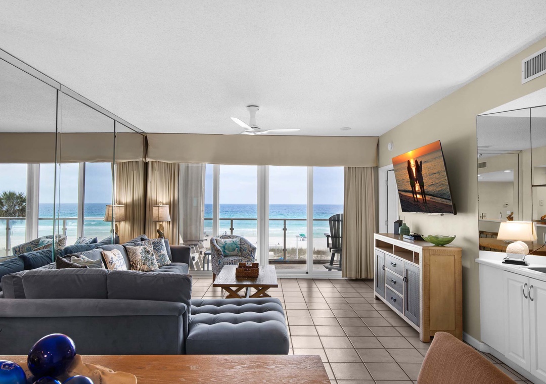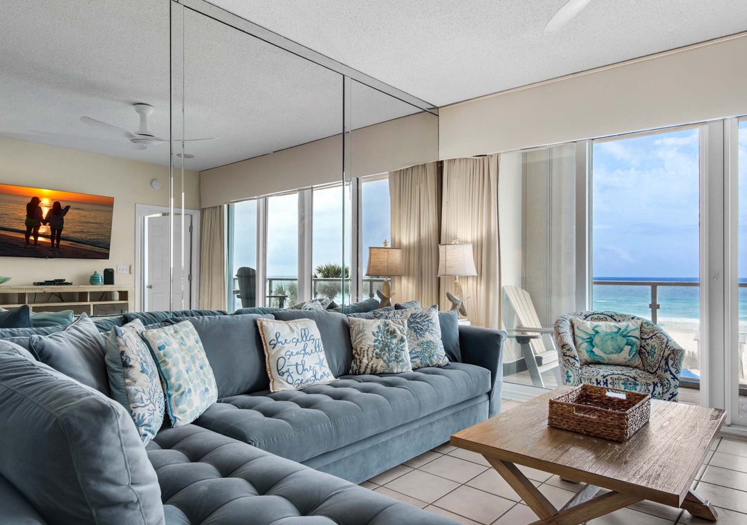 Sterling Sands 209 is a Gulf Front condo located right in the heart of Destin! This 2BR/2BA condo sleeps 6 guests and has unbeatable, wall to wall Beach Views in the living room and master bedroom! There’s a fully equipped kitchen, mini bar, dining table for 6, and barstools for extra seating at the breakfast bar. The master suite has a king bed, wall-mounted flat screen TV, balcony access, and a private bath with a jetted tub and walk-in shower. There’s also a guest room with a queen bed and twin bunk bed and a queen sleeper sofa in the living room. When you’re not catching sun on the beach, splash around in the community pool or explore all the amazing amenities at Sterling Sands! Have a vacation to remember at Sterling Sands 209!
