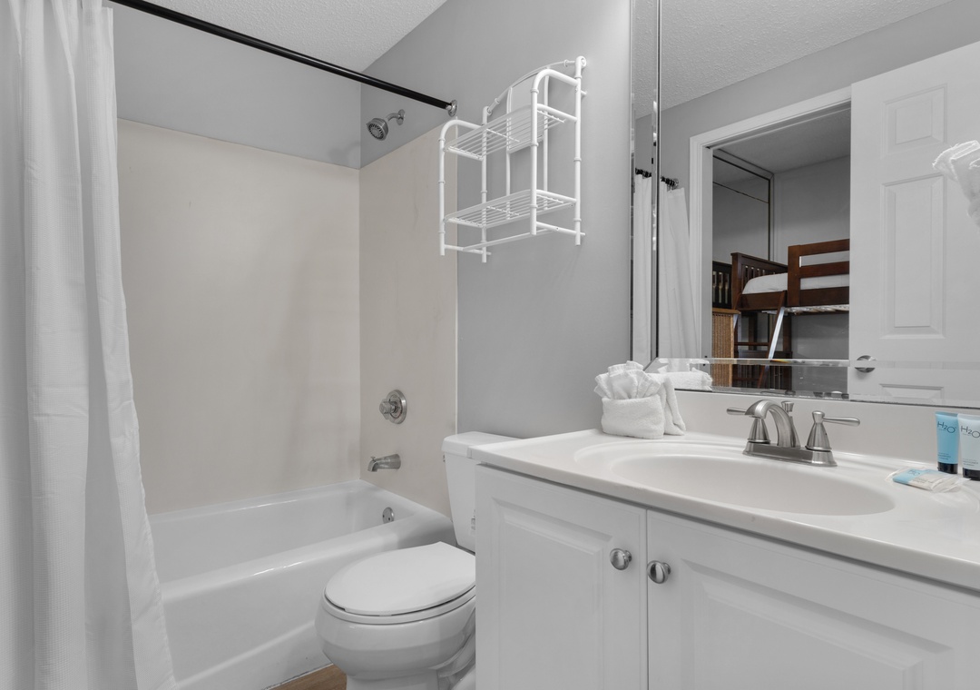 This place was perfect for our family of 4 (2 adults, 7 and 8 year old) it was very clean and the location was FABULOUS! A ride down the elevator and a short walk across the little bridge and you are on the white sands beach. Having the beach chairs and unmbrella included with our stay was so very nice! The kitchen had all we needed. There are bath towels and wash clothes along with a total of 4 rolls of toilet paper and a roll of paper towels. Beds were all comfortable and the kids lo ed the bunk beds. No fan in the kids room and the fan in our room only worked when the light was turned on. That might be user error though lol. We were walking distance to along the beach to back porch which we ate at everyday for one meal and was never disappointed. Not OMG best meal ever but the prices were reasonable and food was good. If you want to do something other than the beach a walk across the street and you are at go carts, games, and mini golf. There is also a shop across the street for any beach needs you may have forgotten ordecide you need while there, again reasonable prices. There is a Walmart a short drive up the street as well. I can't stress enough what a wonderful time we had. Everyone was super nice. We even added an extra day last minute and RealJoy made that a painless process. We also arrived early and though they stress no check in before 4 I called them and asked if the place was ready if we could possibly get in earlier and they were happy to allow us to check in which was so helpful 😀 I 100% recommend staying here.- Reviewed On: 4/20/2021