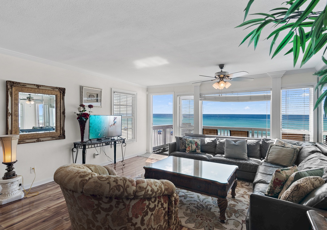 Summer Haven A is a GULF FRONT townhome located just steps away from the most beautiful beaches! This stunning 4BR, 3.5BA home boasts beach views from ALL 3 floors and sleeps 10 comfortably. The first floor consists of two guest rooms with queen beds, with a sleeper sofa in the first room. The second guest room has an ensuite bathroom and balcony access, with direct views of the gulf! The kitchen and living spaces on the second floor include a large dining table and breakfast bar, a half bathroom, TV, laundry room, and access to the balcony. The third floor has 2 king master bedrooms, both with private bathrooms. With the BEACH as your backyard, this Miramar Beach townhome will make your next vacation a one to remember!