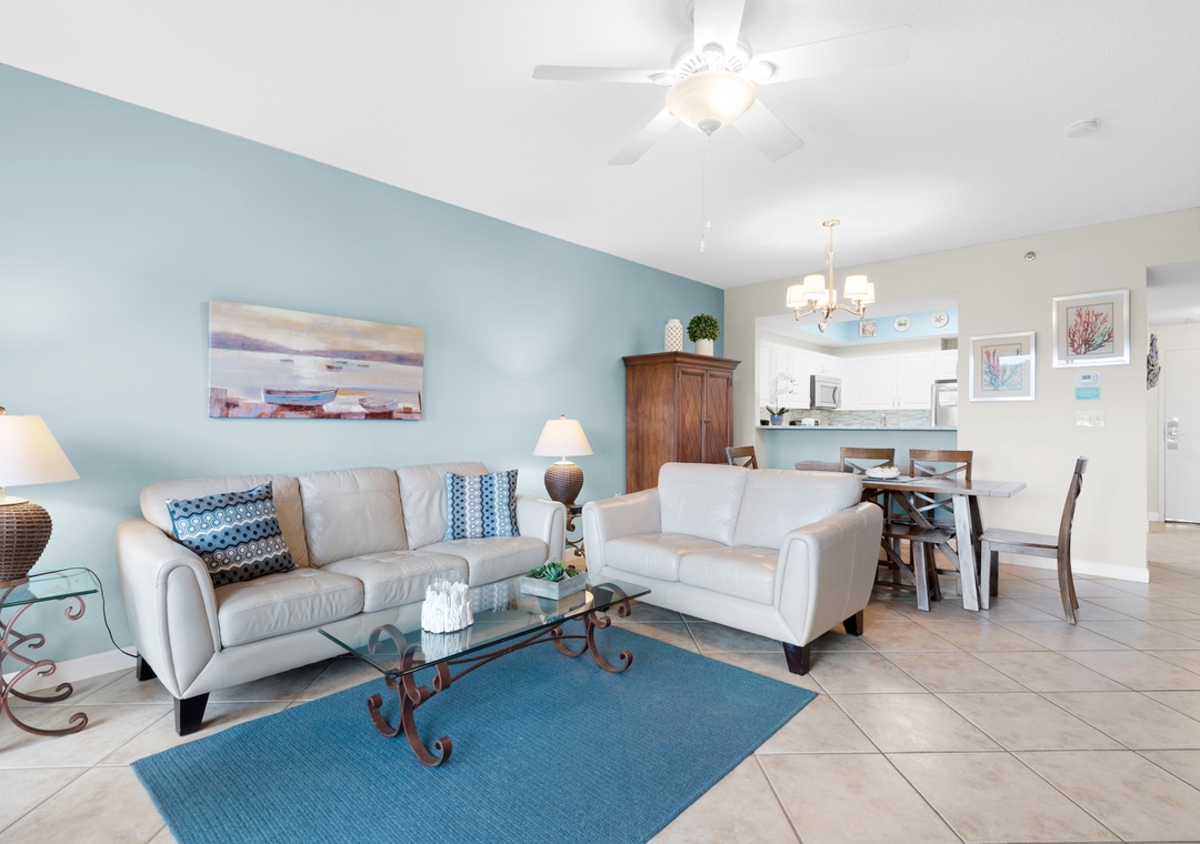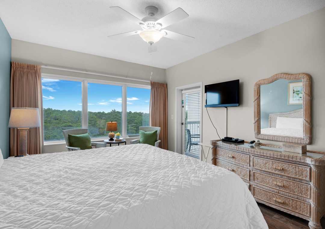 The Summit at Tops’l 403 is a fourth-floor condo in Tops'l Beach and Racquet Resort with 2 bedrooms and 2 full baths. Step out onto the spacious balcony and soak in the sound of the waves crashing on the shoreline! This condo features a full kitchen with a dishwasher, stackable washer/dryer, granite countertops, double vanities in the master bedroom, and a balcony that is accessible from the living room and master suite! With a king bed in the master and two full beds in the second guest room, this lovely space sleeps 6. There is also a queen sized blow up mattress in the unit. Make this your next beach vacation, and you'll be just steps from the pool and a short stroll (about 400 yards) to the beach!