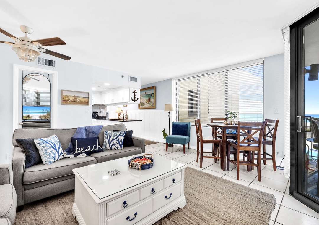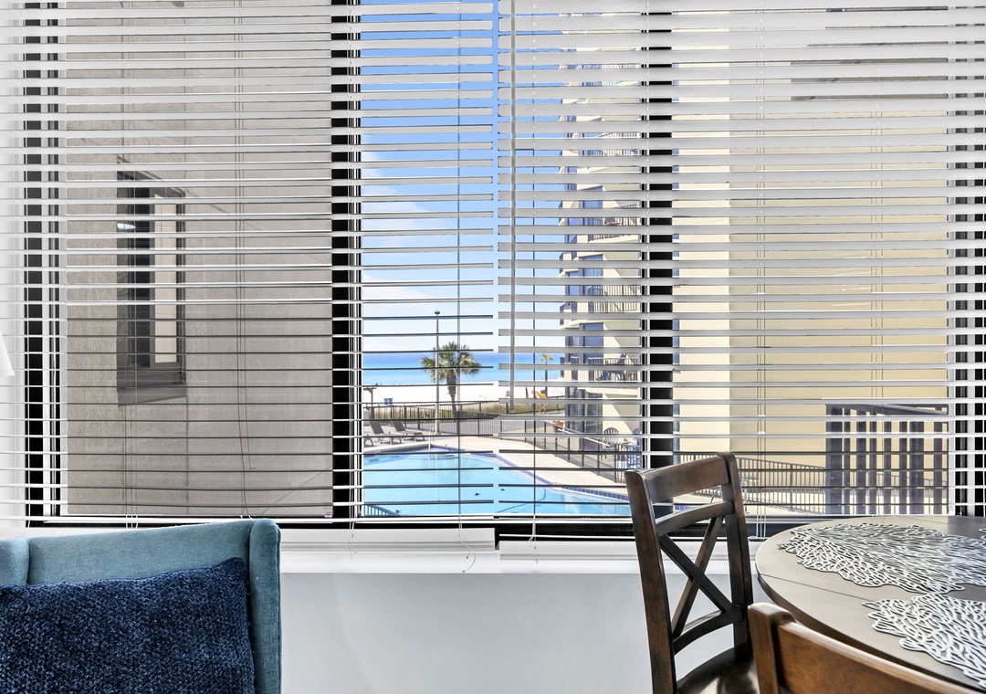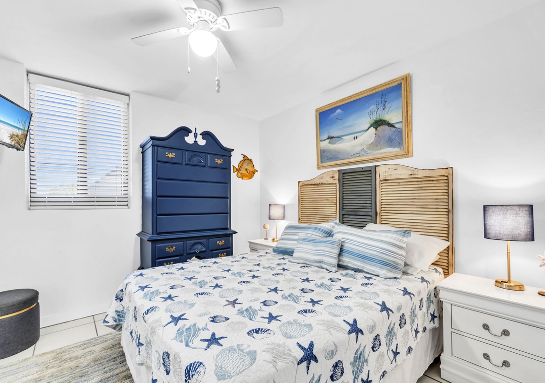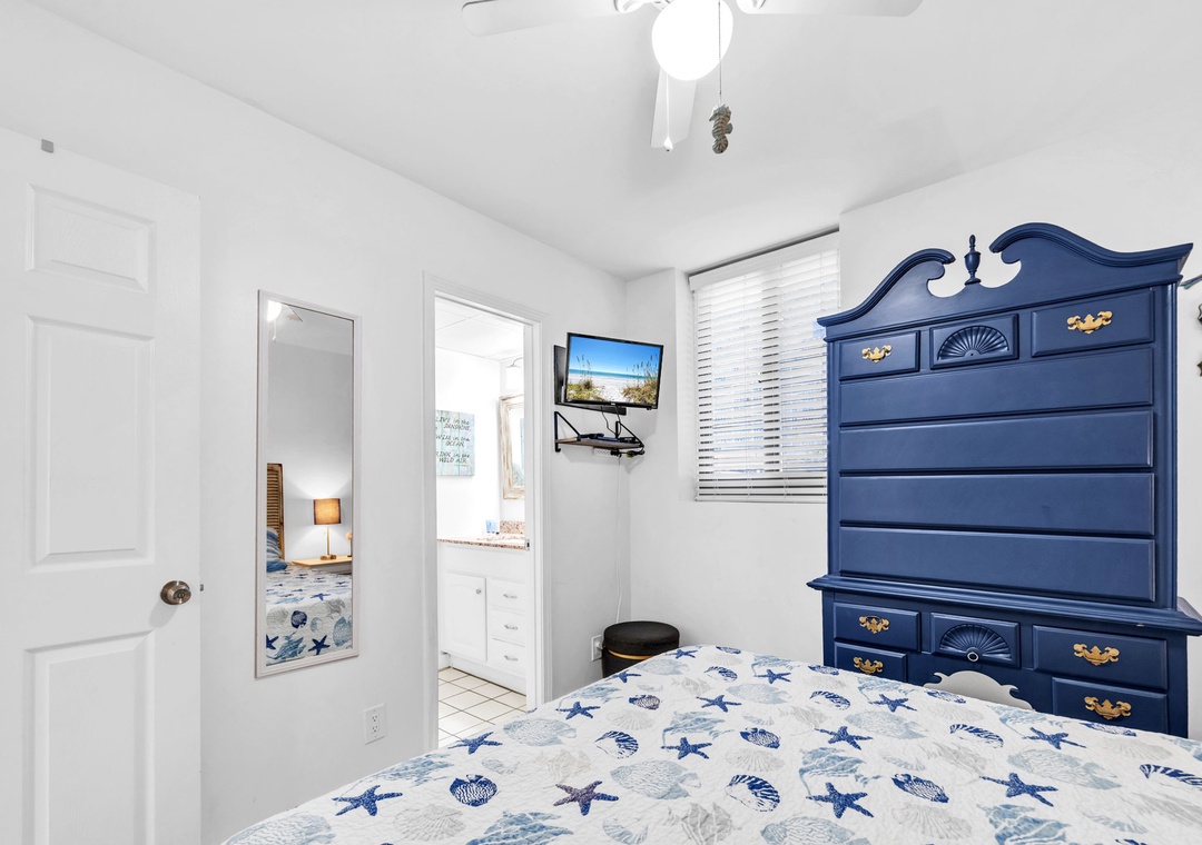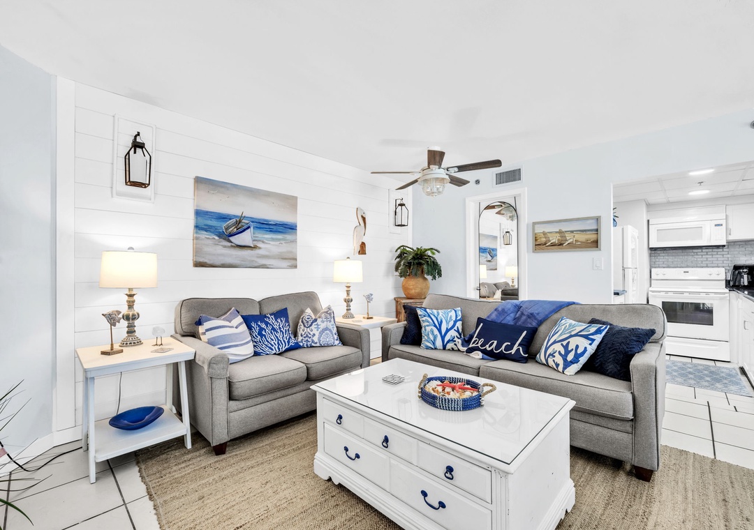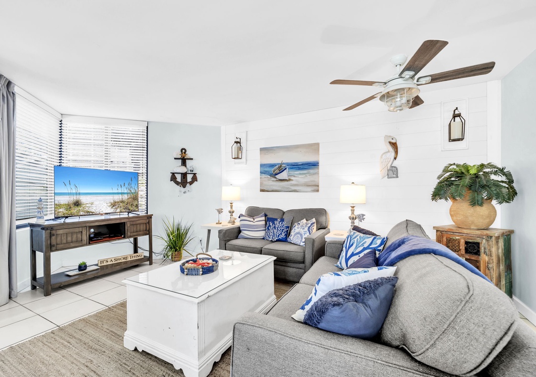 Welcome to Sunbird 212E, a charming one-bedroom, one-bath corner condo designed for relaxation and comfort. This unit features a fully equipped kitchen, a dining area, and a cozy living space that opens to a private balcony. Floor-to-ceiling windows showcase breathtaking views of the Gulf and the seasonally heated pool below. Wake up with coffee on the porch, soaking in the warm coastal breeze, or wind down with stunning sunset views. The condo comfortably sleeps up to four guests, with a queen bed in the bedroom and a sleeper sofa in the living room. Enjoy a movie night on the flat-screen TV after a day at the beach. The Sunbird complex offers three pools, including the only seasonally heated one right outside your door, along with outdoor grills, a fitness center, and a community laundry facility on the first floor. Whether you're cooking in, lounging poolside, or exploring the beach, Sunbird 212E is your perfect coastal getaway.