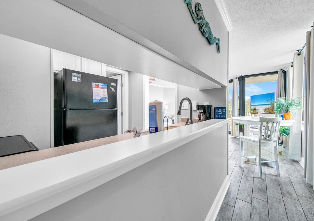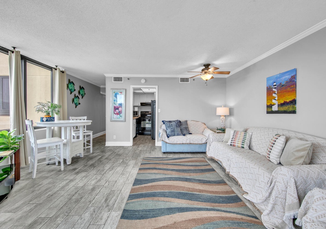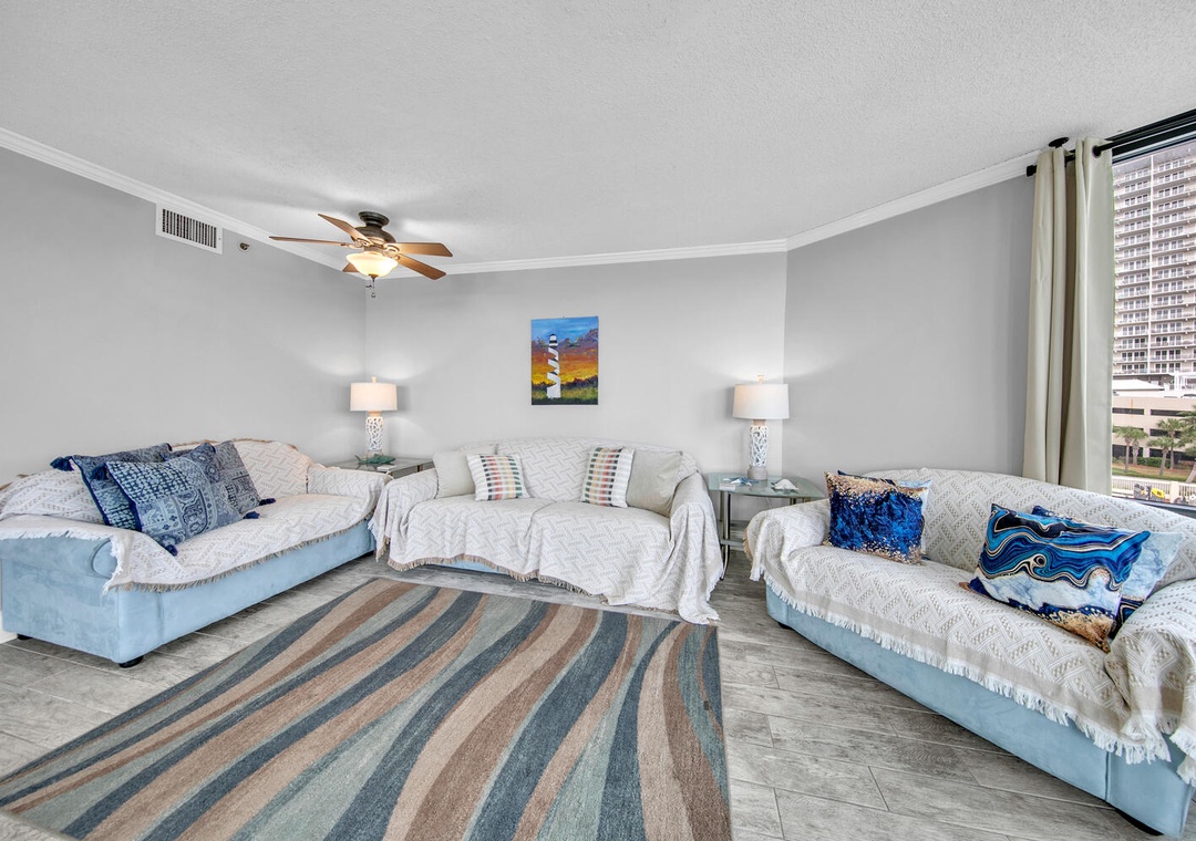 Inside, the condo is fully equipped with everything you need for a relaxing stay, including a full kitchen and a comfortable living area with access to the balcony. The master bedroom features a queen bed, while the living room offers a queen sleeper sofa and twin pull-out, comfortably sleeping up to 4 guests. The dining area, perfect for meals or game nights, also boasts gorgeous Gulf views.