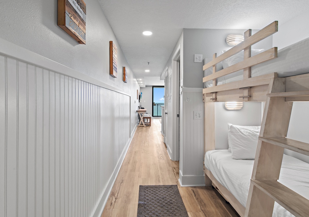 SunDestin 1008 is a Gulf Front, 1BR/1.5BA condo in the heart of Destin. This beautiful 10th-floor condo has floor-to-ceiling beach views from the living room, kitchen, and balcony where you and your guest can Gaze across the endless gulf shoreline. The bedroom has a king bed with an en suite bathroom. Nestled away in a hallway, you will find twin over twin bunk beds and a queen-sized sleeper sofa in the living room, allowing this unit to sleep up to 6 guests comfortably. Splash around in the indoor and outdoor pool, catch some rays on the sugar white sand beach, or relax on the beachfront balcony! Come see why SunDestin 1008 is a Destin favorite!