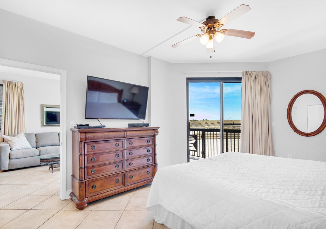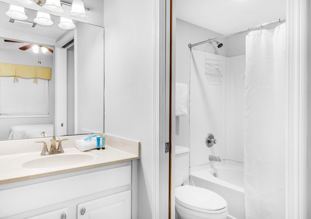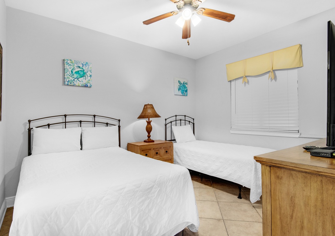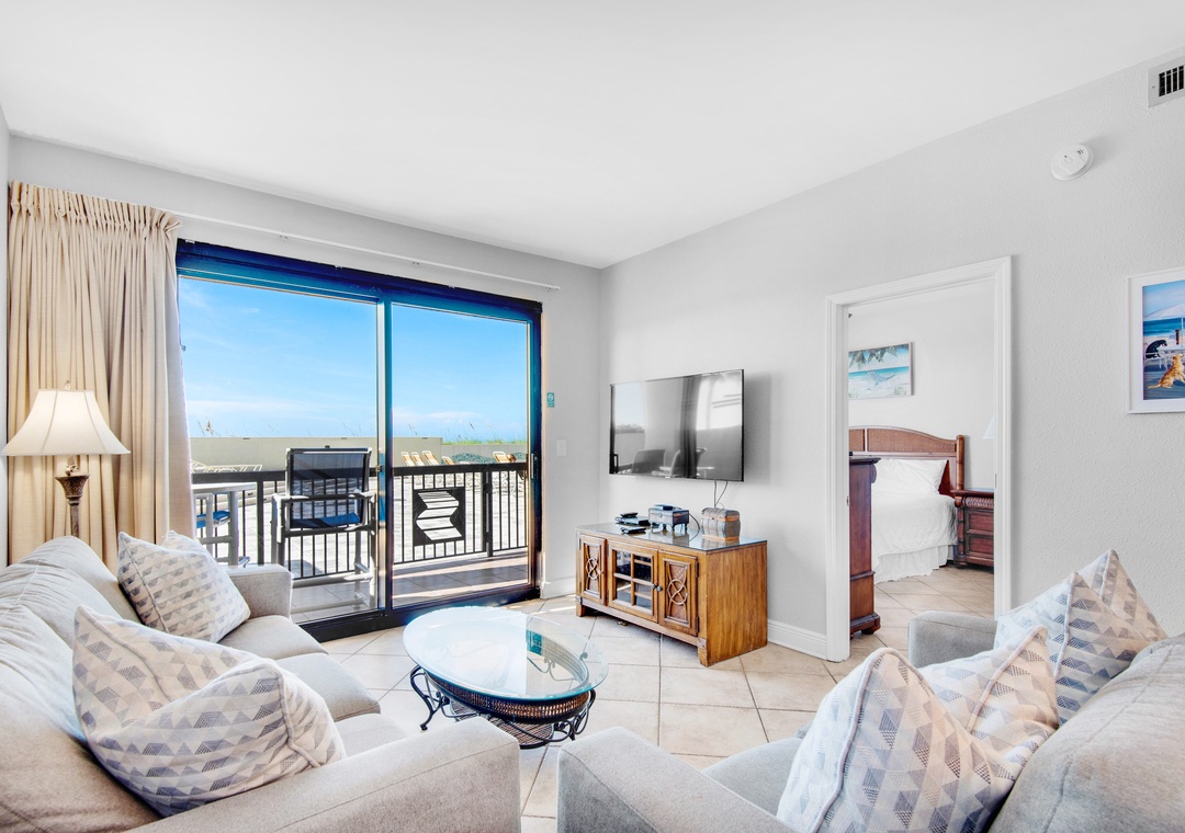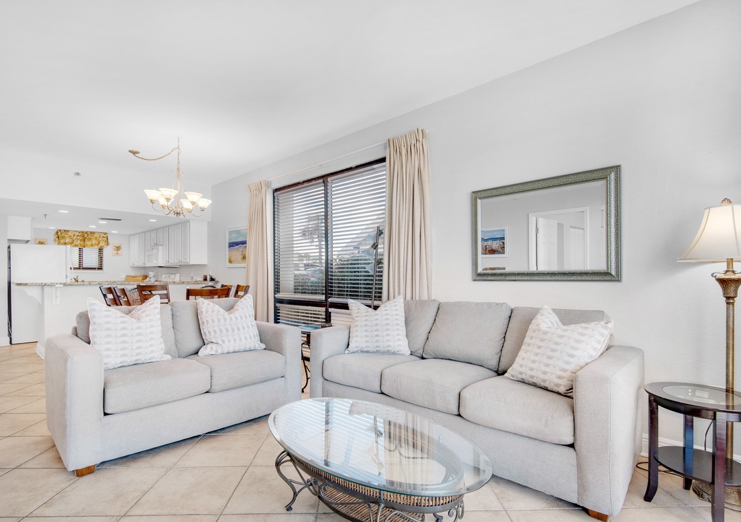 SunDestin 101 is a 1st floor, two bedroom/two bath condo of a Gulf front complex in the heart of beautiful Destin! This master bedroom has a king-size bed an attached private bath. The second guest room has a full and a twin with an attached bathroom. The sofa converts to a queen-sized bed and there are three flat screen TVs. With a spacious kitchen and tile throughout, SunDestin 101 is sure to please.
