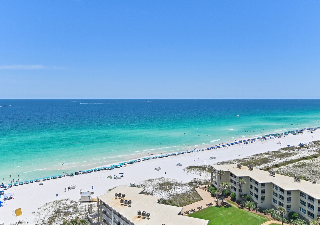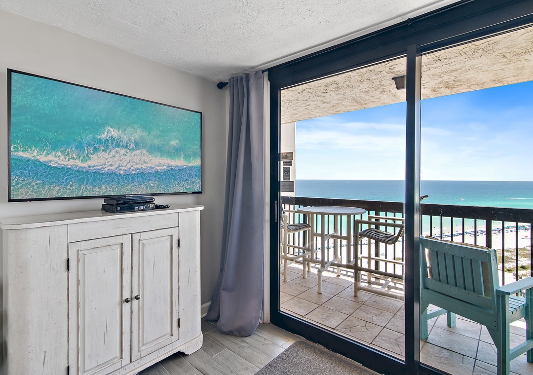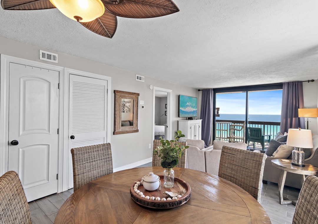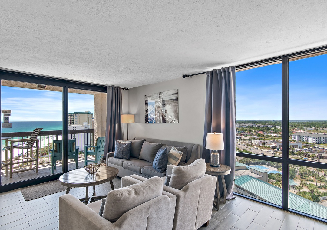 Welcome to SunDestin 1818, your perfect beach getaway in the heart of Destin, Florida—just steps from the sugar-white sands and sparkling turquoise waters of the Gulf of Mexico! This top-floor penthouse retreat offers the best of both worlds: sweeping city views through floor-to-ceiling windows (you might even catch a dazzling fireworks show!) and tranquil Gulf vistas from your private balcony, accessible from both the living room and master bedroom. You may even spot dolphins playing in the surf! Inside, you'll enjoy panoramic water views from every window, and a fully updated interior designed for comfort and style. The modern kitchen is fully equipped with everything you need to dine in—including an air fryer and Instant Pot for convenient cooking. Whether you're sipping wine on the balcony at sunset, enjoying a family meal, or just unwinding after a day at the beach, this space is designed to help you relax and feel at home. Walk to Destin's Favorite Beachfront Dining!