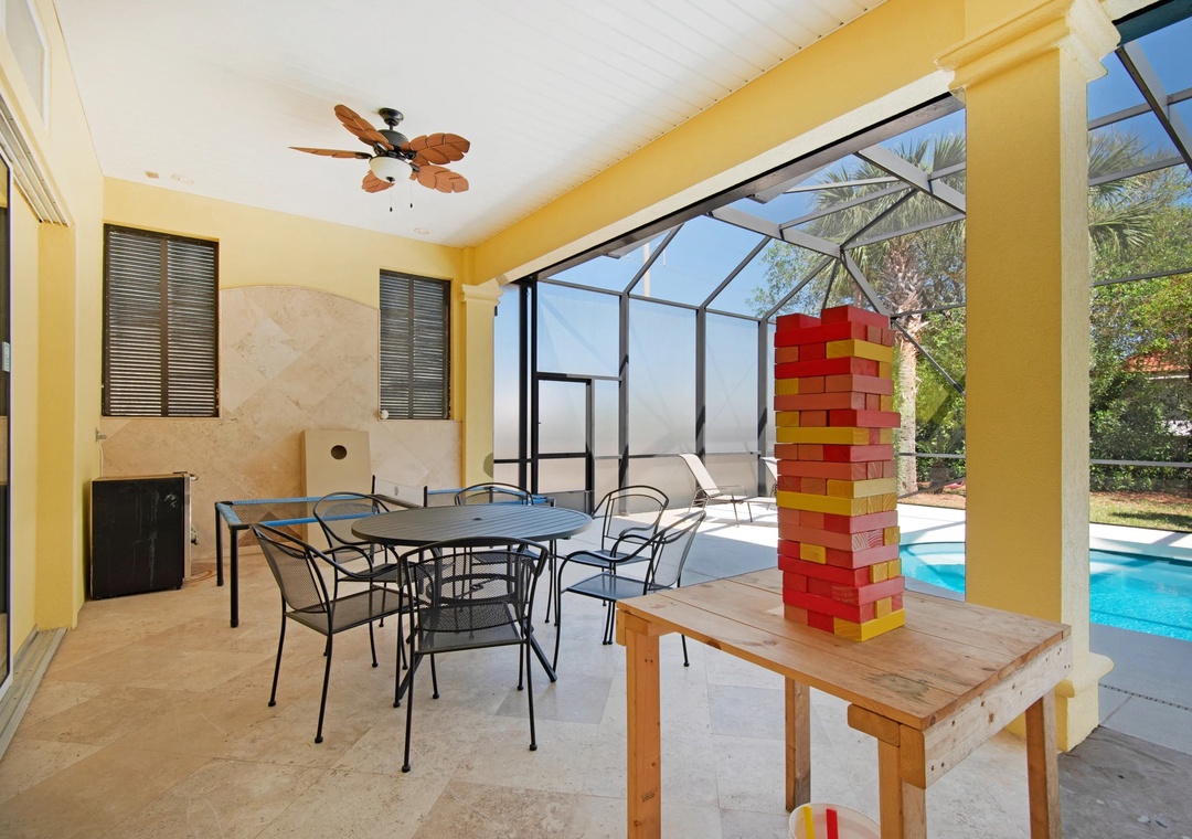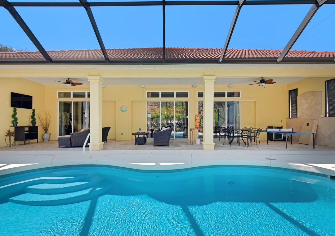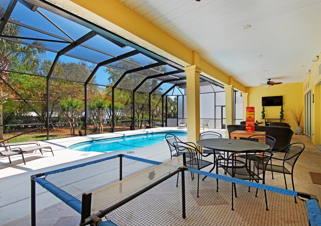 * Covered Pool Deck with Flatscreen Tv, Ping Pong, and Seating