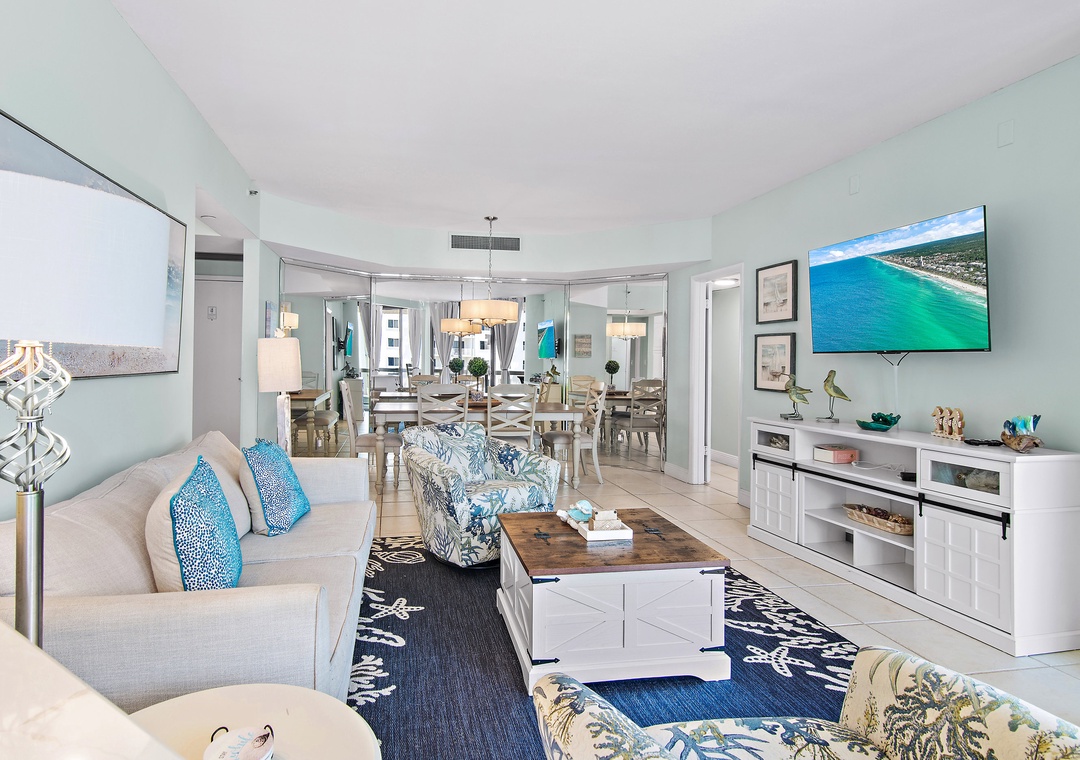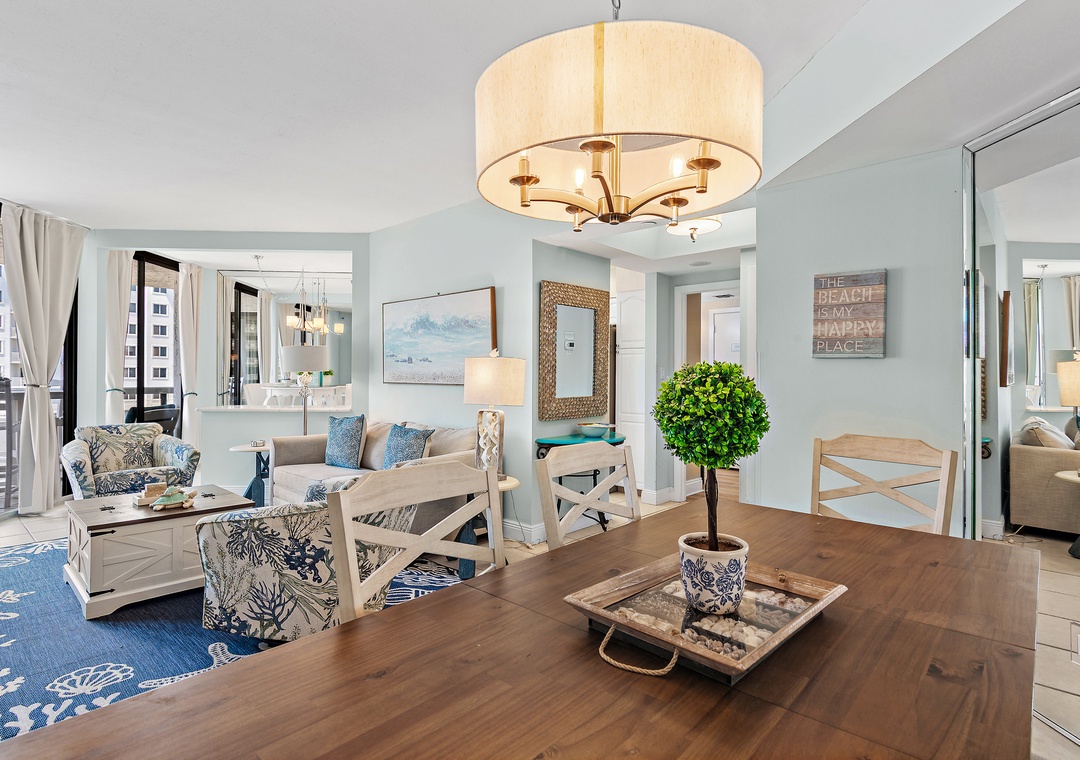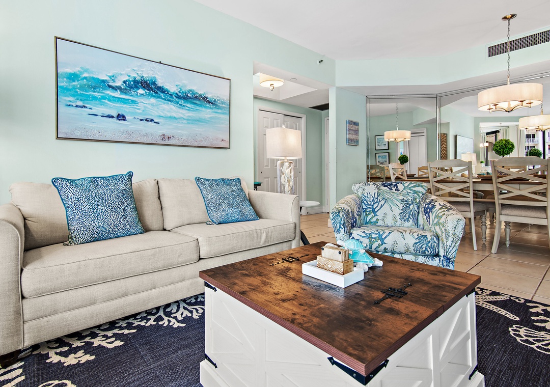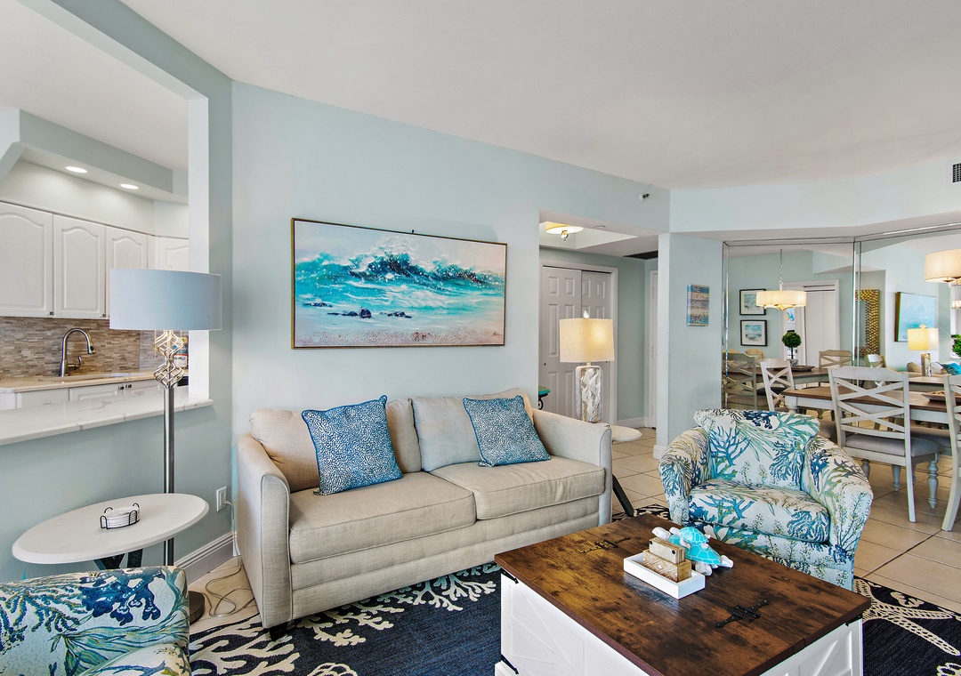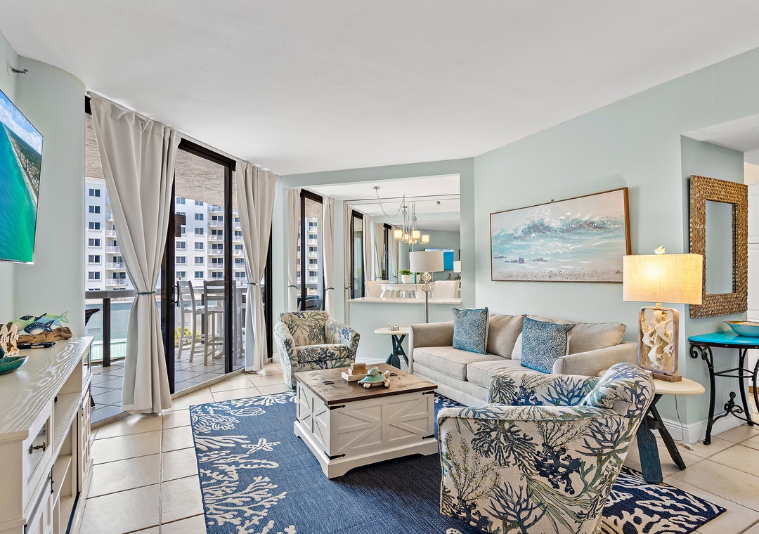 Surfside Resort 410 is a gorgeous 2-bedroom, 2-bathroom condo located on the 4th floor, thoughtfully updated with new balcony furniture, fresh curtains, and new master bedroom chairs. This unit features Surfside’s unique angled floor plan—definitely not the typical shotgun style—allowing every room to open onto an expansive 28-foot balcony with breathtaking Gulf views and unforgettable sunsets. The master bedroom offers a king bed, the guest bedroom includes two full beds, and the living room has a sleeper sofa, comfortably accommodating up to 8 guests. A fully equipped kitchen makes meal prep easy, and the resort’s convenient sky bridge provides direct access from the pool area to the sugar-white sand beaches. After a day in the sun, relax on your private balcony with your favorite drink and soak in the scenery—Surfside Resort 410 is the perfect spot for your beach getaway.