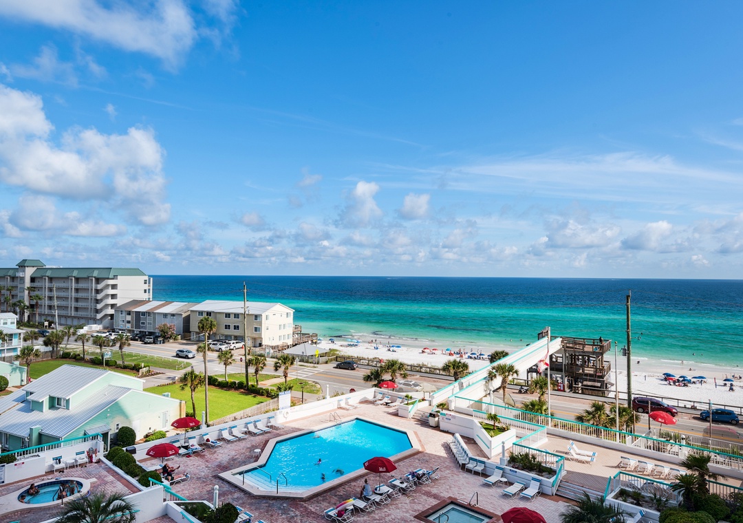Surfside Resort is located next to the Seascape Resort and right across the street from beautiful the Gulf of Mexico! The sky bridge connects you directly from the pool area to the sugar white beach. Located just down the street from the Silver Sands Outlet Mall as well as a variety of many different restaurants and Bars. Surfside offers a large pool on the second floor, a children’s pool, two whirlpools, as well as poolside showers. With plenty of lounge chairs around the pool and a Tiki Hut that is open during the season, this is a great place to relax and soak up the sun! For those guests looking for more activities to do during the day, Surfside offers two tennis courts, basketball, shuffleboard, and a fitness center. Surfside is also located right next door to the Seascape Golf Center, very convenient for golf lovers! Sport fishing is just minutes down the street at the Destin Harbor with some of the best fishing around. You will find Surfside has everything you could want in a resort to make your vacation memorable!