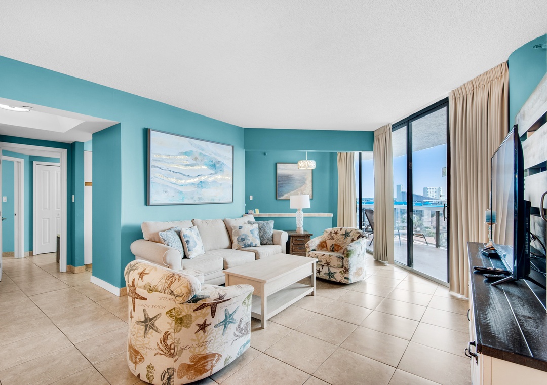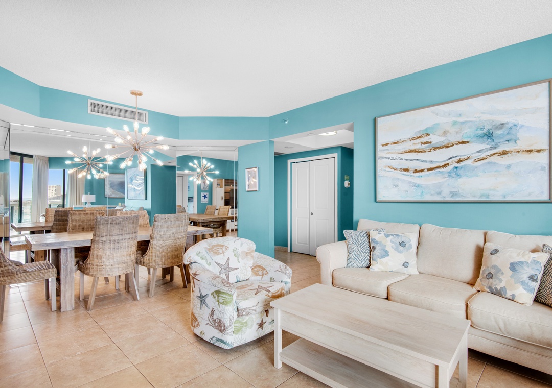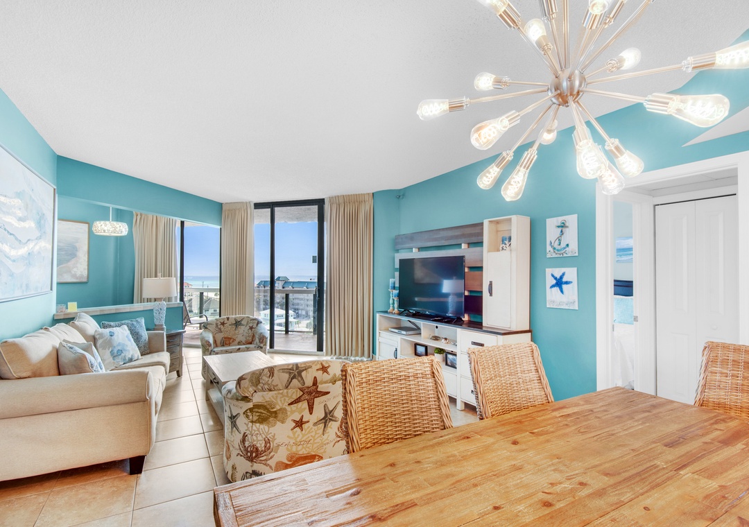 Surfside Resort #707 is a beautifully decorated 2BR/2BA condo that overlooks the Gulf of Mexico. Enjoy spectacular Gulf Views from your large, 7th-floor balcony that is accessible from both bedrooms and the living room! With a king bed and a chair that extends into a sleeper sofa in the master bedroom, two full-sized beds in the guest bedroom, and a sleeper sofa in the living room, this condo sleeps 9 guests comfortably. Wake up early and step out on your balcony and enjoy the sunrise while having a cup of coffee. Enjoy the convenience of the sky bridge that connects you directly from the pool area to the beautiful sugar-white sand beaches! This condo has plenty of room for you to host your family and friends for a fun-filled day at the pool or beach. Come check out Surfside Resort #707 for your next perfect beach vacation!