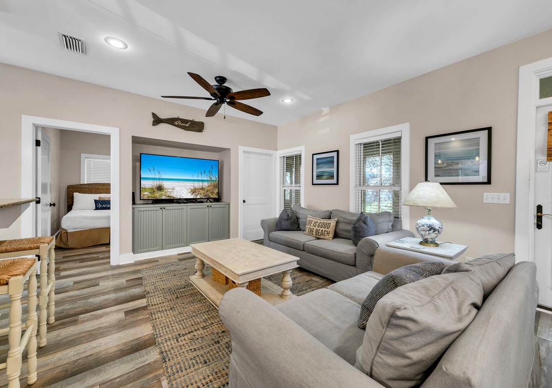 Inside, you’ll find a bright open floor plan, rich hardwood floors, granite countertops, stainless steel appliances, and a spacious kitchen perfect for gathering after a day in the sun. The living area is designed for comfort, with plush seating and flat-screen TVs for movie nights or game days. The oversized screened-in porch — breezy, peaceful, and made for slow mornings, afternoon naps, and laughter-filled evenings. Whether you're biking along 30A, poolside with the kids, beach hopping, or exploring nearby coastal towns, this home is your perfect home base.