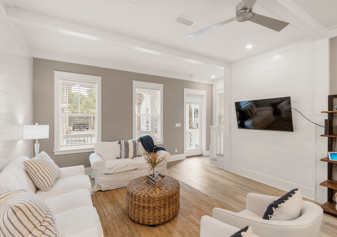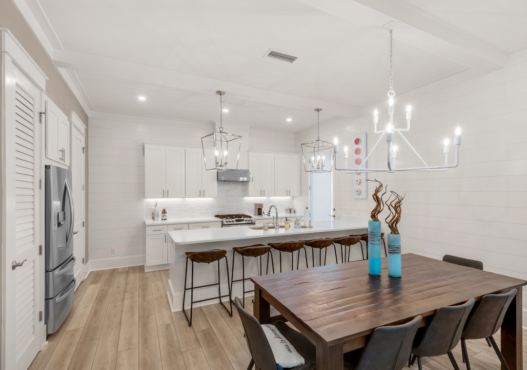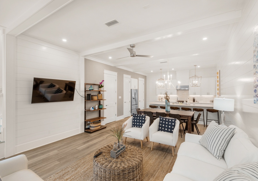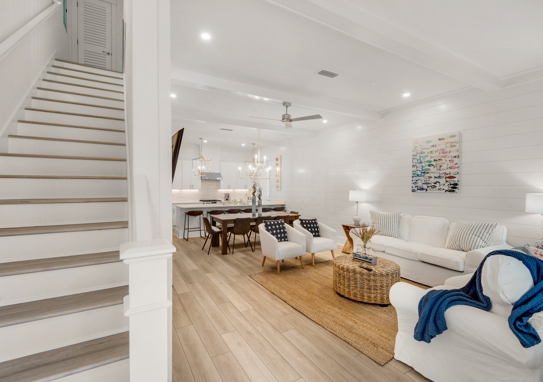 Land your perfect vacation at The Eagles Nest! This newly built 4 bedroom, 4.5 bath home is located in the popular 30A community of Seacrest Beach. Situated only 700 yards from beach access and easy walking distance to Rosemary Beach, this stunning home features shiplap walls, ceiling beams, a bright white kitchen with granite countertops, and upgrades throughout. The second floor contains a king bed in the master bedroom and a queen bed in the guest room, while the third floor includes a queen bed in the 2nd guest room, and a bunk room with two twin-over-twin bunk beds. This beautiful home can sleep 10 guests comfortably. Sip your beverage of choice on the 3rd-floor sun deck, take a dip in the huge community pool, or ride the seasonal tram to the beautiful beaches! Come home to roost at The Eagles Nest for your next beach vacation!