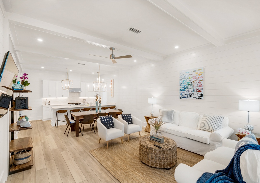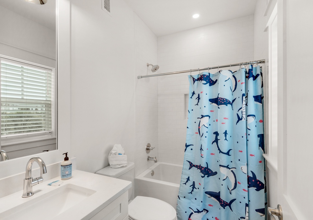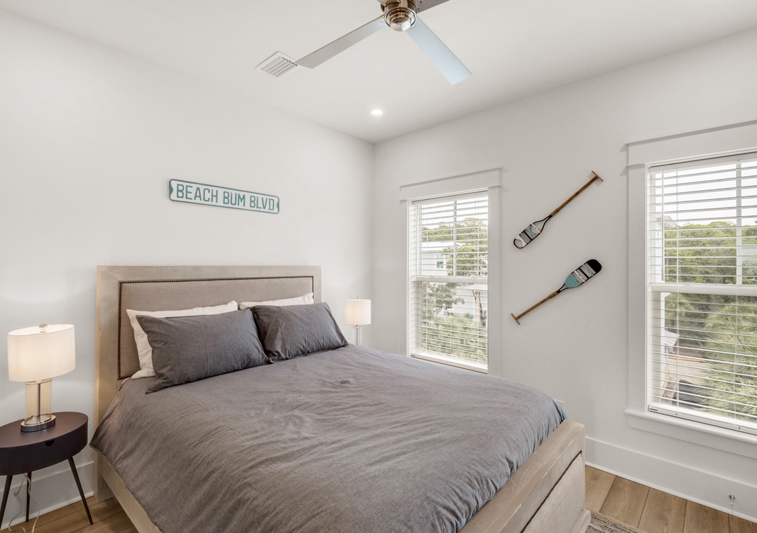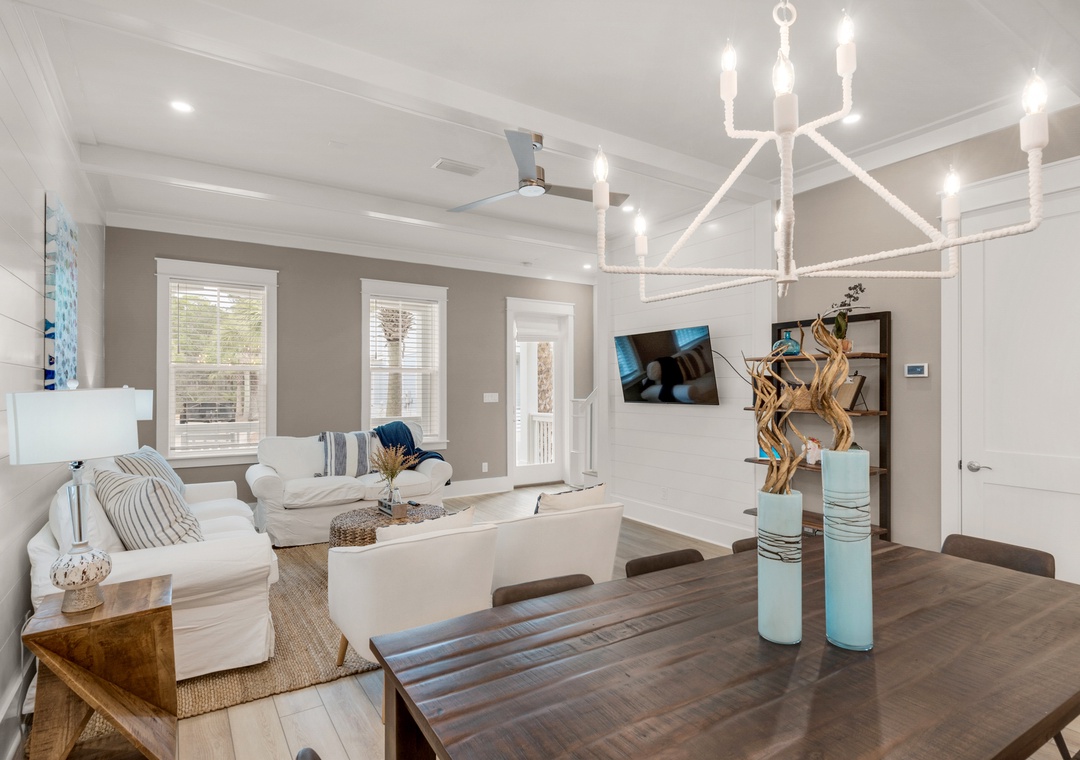 Land your perfect vacation at The Eagles Nest! This newly built 4 bedroom, 4.5 bath home is located in the popular 30A community of Seacrest Beach. Situated only 700 yards from beach access and easy walking distance to Rosemary Beach, this stunning home features shiplap walls, ceiling beams, a bright white kitchen with granite countertops, and upgrades throughout. The second floor contains a king bed in the master bedroom and a queen bed in the guest room, while the third floor includes a queen bed in the 2nd guest room, and a bunk room with two twin-over-twin bunk beds. This beautiful home can sleep 10 guests comfortably. Sip your beverage of choice on the 3rd-floor sun deck, take a dip in the huge community pool, or ride the seasonal tram to the beautiful beaches! Come home to roost at The Eagles Nest for your next beach vacation!