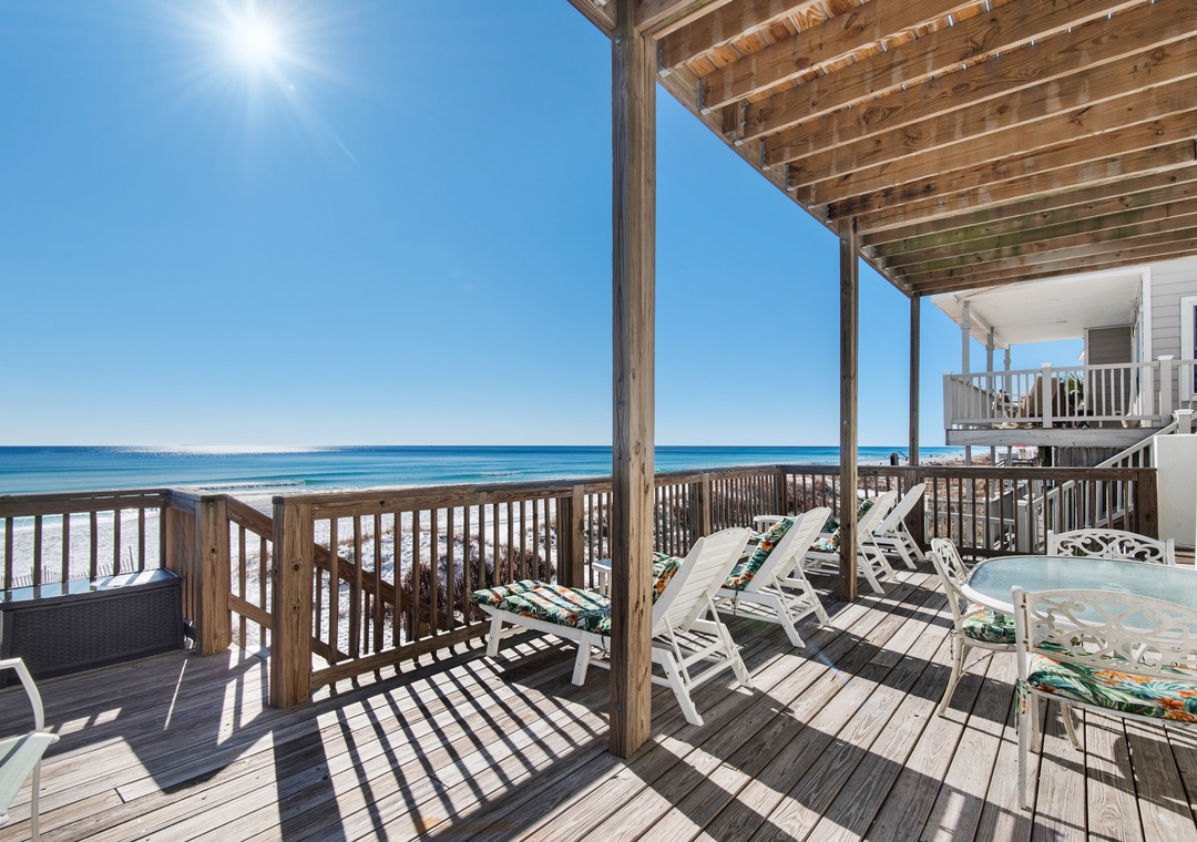 The Land of Ahhhs is a beautiful newly remodeled Gulf Front Beach House in Miramar Beach. This 6-bedroom, 5-bathroom home sleeps 20 guests and has 5 dedicated parking spots, making it the perfect getaway for family vacations, large groups, and weddings on the beach! Step out of your back door and onto the white sands of the Emerald Coast! Savor every sunrise and sunset from any one of the 3 full balconies complete with dining and lounging areas! Ideally located right on Scenic Highway 98, you are close to a multitude of local shops and restaurants. The 2nd floor houses the main open-concept living area with a fully appointed kitchen with a double oven, custom cabinets, and an eat-in bar for 4, a sophisticated but cozy living area highlighted by an electric fireplace, and a dining table that seats 8. The balcony on this level has a grill and a new built-in eat-in bar, and the floor has been extended for even more space! Complimentary beach service is included each morning that includes 4 chairs and 2 umbrellas from March-October. This also makes beach days with children simple and fun! If you're looking for an effortless vacation experience in paradise with the best ocean views the Gulf has to offer, this is your home away from home.