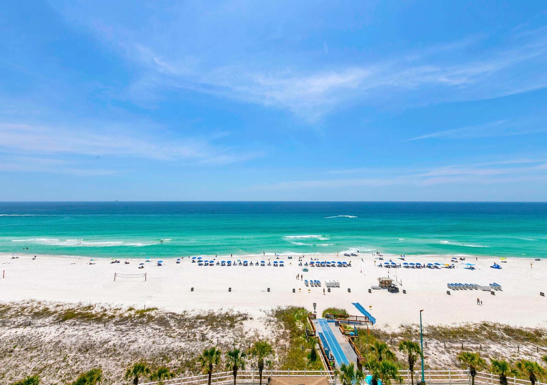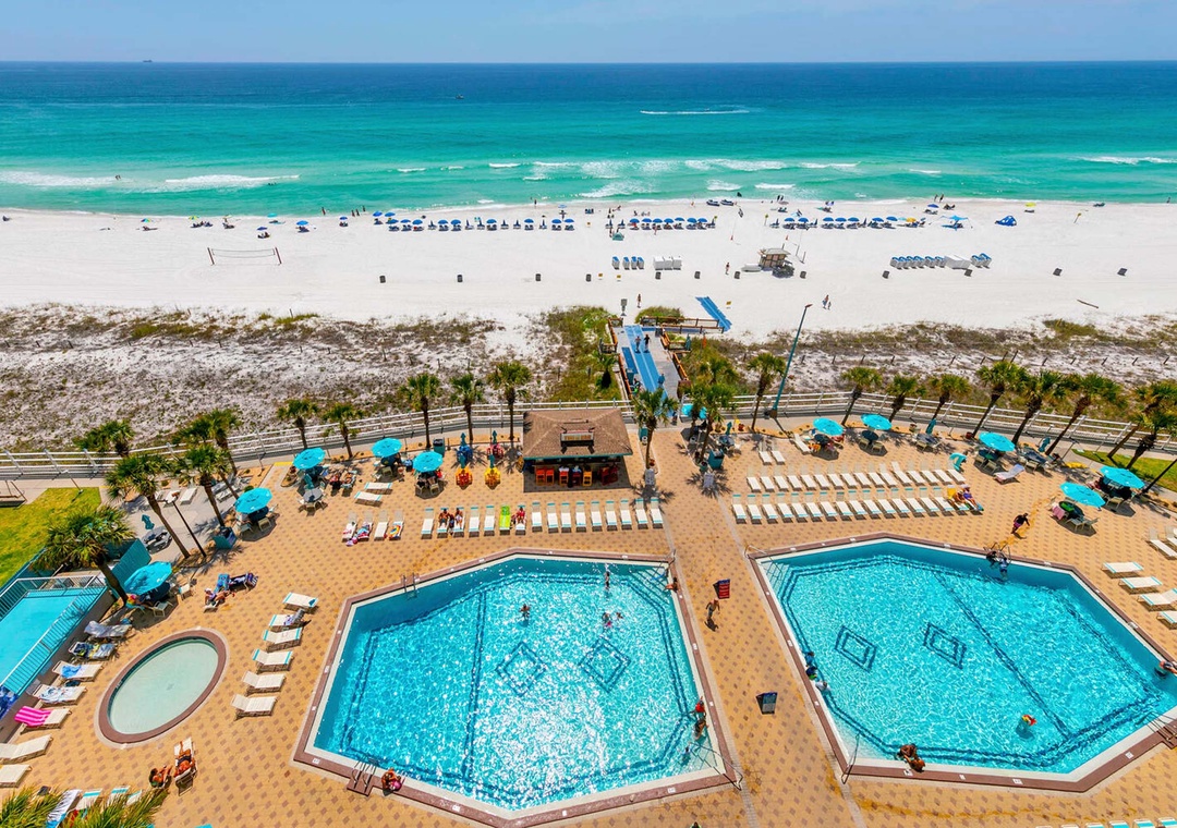The Summit is located beachfront in Panama City Beach! Vacation rentals here have incredible Outdoor Amenities, including: Two Large outdoor pools, two children's pools, two large outdoor hot tubs, one large indoor hot tub, His and Hers Sauna Steam Rooms, Lighted Tennis Courts, Shuffleboard Court, Beach Services, Water Sports Center, Bikini Bob's restaurant, Beach Volleyball, and Poolside Tiki Bar. Indoor Amenities include a Convenience Store, Snack Bar, Fitness Center, coin-operated laundry, Free local calls, Charcoal BBQ Grills, Arcade, and Vending Machines.