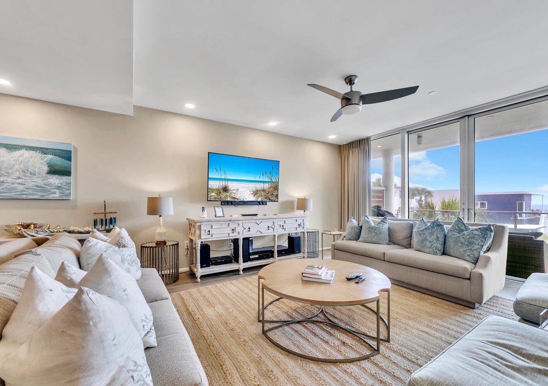 This luxurious 3-bedroom, 3.5-bathroom condo offers spectacular views of the sparkling emerald waters, located in the heart of Seagrove Beach. The gourmet kitchen is a true standout, complete with custom-blown glass pendant lighting, a Sub-Zero fridge, a Wolf gas stove/oven, an Asko dishwasher, and custom-built countertops.