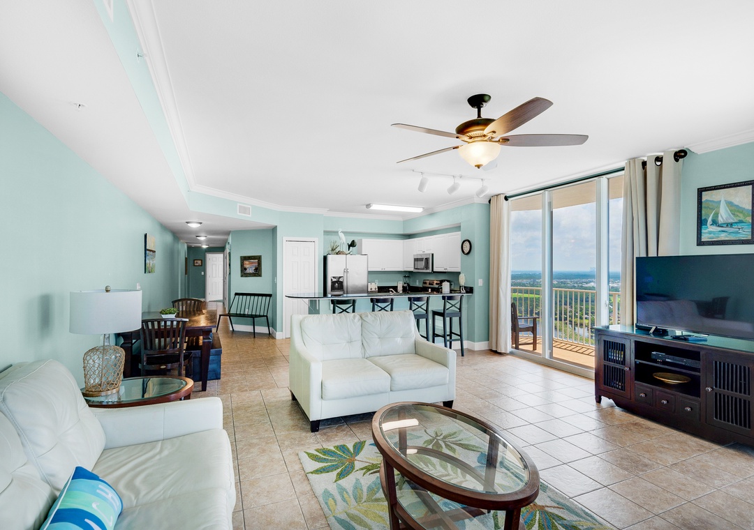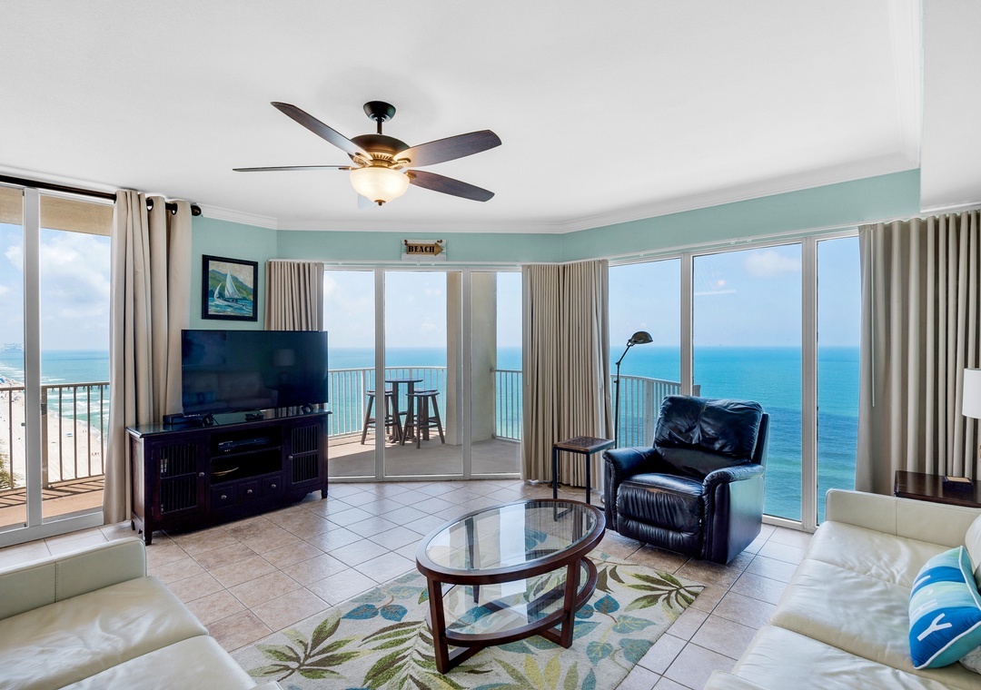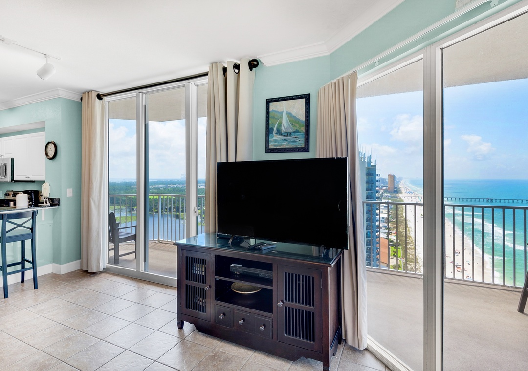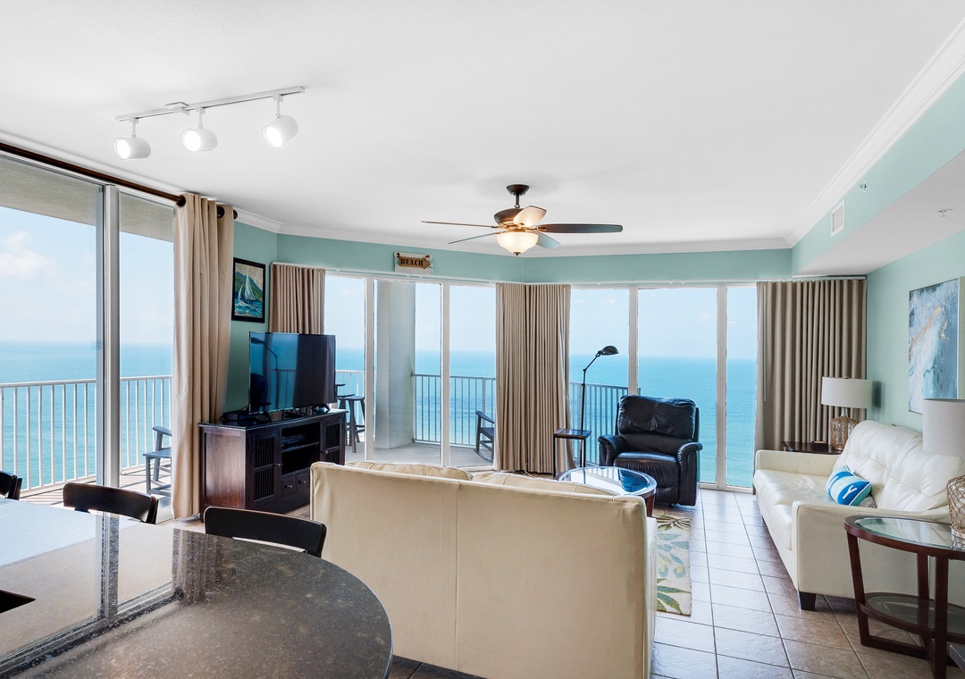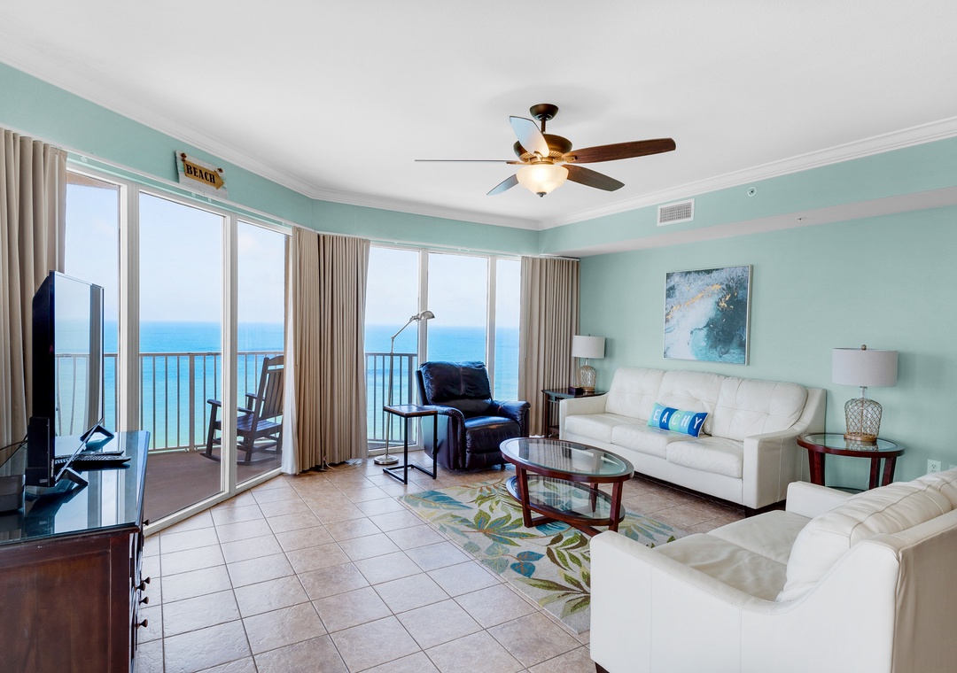 Tidewater 2117 offers Gulf Front views from the living room, kitchen, and wraparound balcony! This lovely 3BA/3BA corner condo features a fully equipped kitchen with granite counters and stainless-steel appliances. Have a seat on the spacious balcony and enjoy the birds eye view of the coastline. There is a king bed in each of the bedrooms, a twin bunk bed in the hallway, and a queen sofa sleeper in the living room, sleeping up to 10 guests comfortably. With stunning beachfront views, incredible resort amenities, and located under a mile from Pier Park, you're sure to have a perfect vacation at Tidewater 2117!