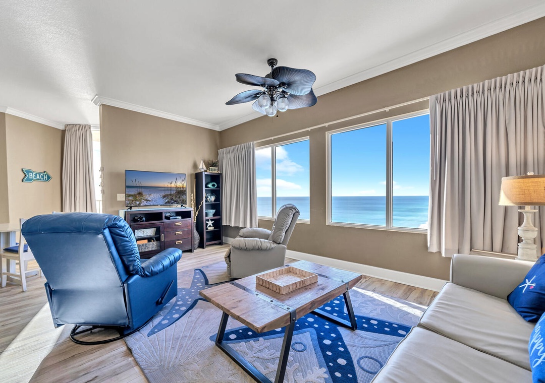 Tidewater 2700 offers floor to ceiling Gulf Front views from the living room, kitchen, and balcony! This spacious, updated 2 bedroom, 2 bath condo features tile flooring and beautiful beachy decor throughout! You will find a fully equipped kitchen with granite counters, all stainless steal appliances, and gorgeous views of the Gulf. There 's a king bed in the master bedroom, a queen bed in the guest bedroom, and a sleeper sofa in the living room, sleeping a total of 6 guests comfortably. You'll also have a washer/dryer in the unit for additional convenience. With stunning 27th floor beachfront views, incredible resort amenities, and located under a mile from Pier Park, you're sure to have a perfect vacation at Tidewater 2700!