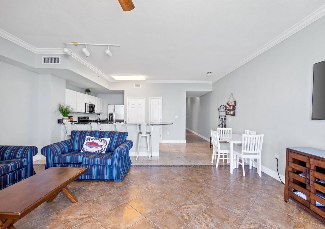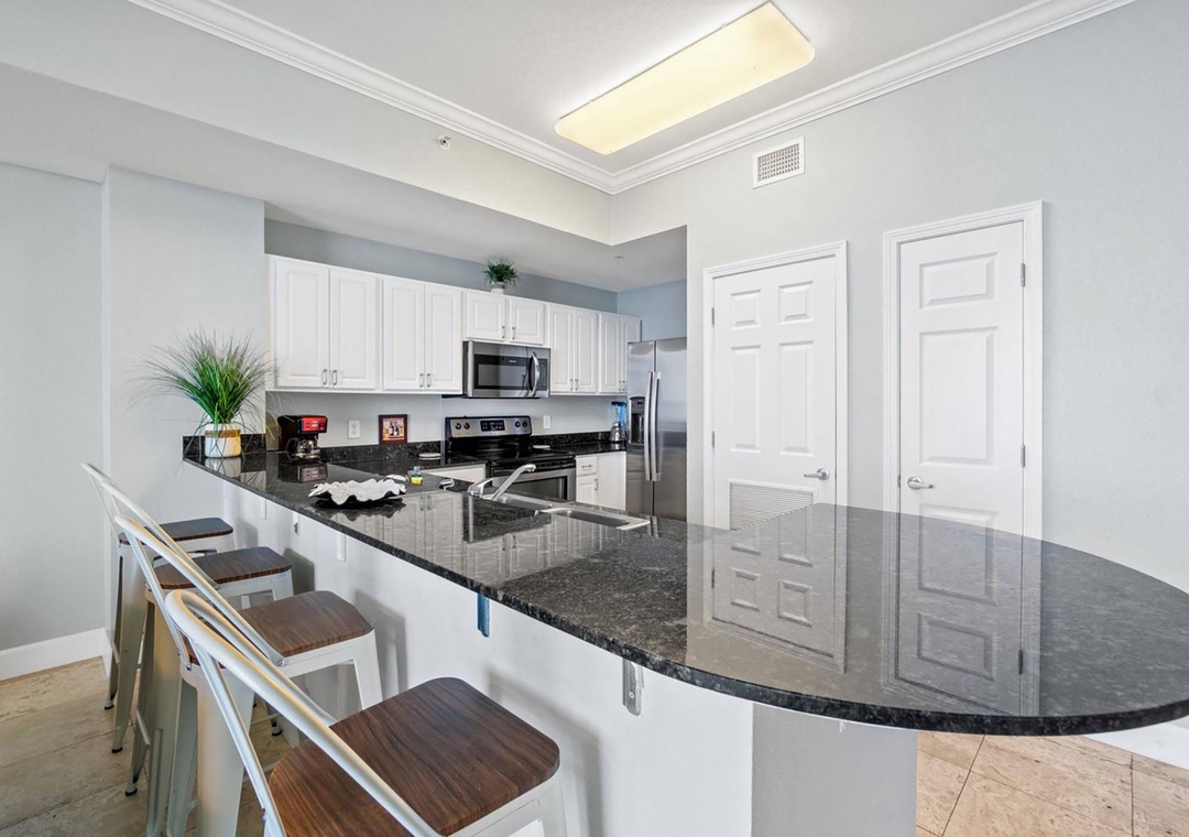 Soak in breathtaking floor-to-ceiling Gulf front views from the living room, kitchen, and your private balcony at Tidewater 2903. Let the sound of waves be your daily soundtrack as you relax above the shoreline. This beautifully updated 1-bedroom + bunks, 2-bath condo features an open layout, modern flooring throughout, and a fully equipped kitchen with sleek granite countertops—perfect for preparing meals after a day on the beach. The spacious king bedroom includes a private en suite bathroom, and twin hallway bunks provide cozy accommodations for up to 4 guests. Set within the amenity-rich Tidewater Beach Resort and located less than a mile from the vibrant shops and dining at Pier Park, this condo is your ideal home base for an unforgettable beachfront getaway.