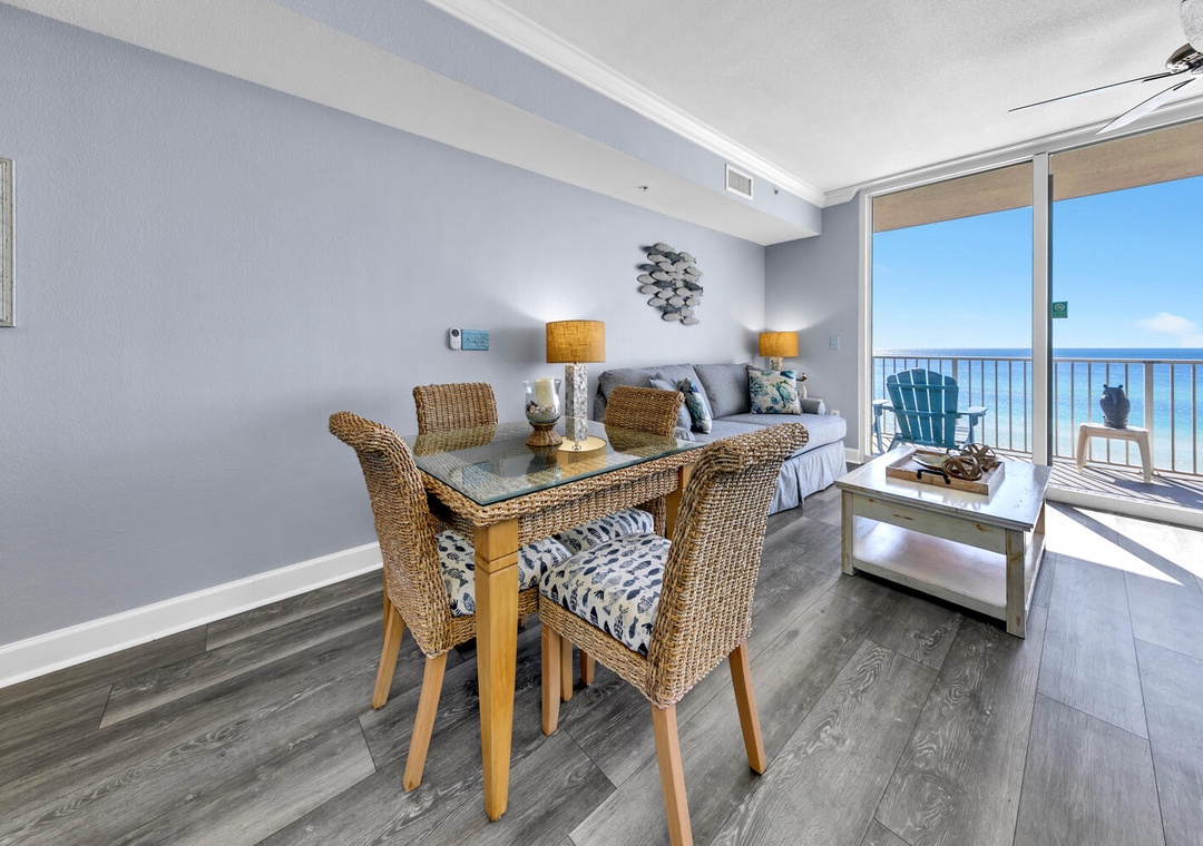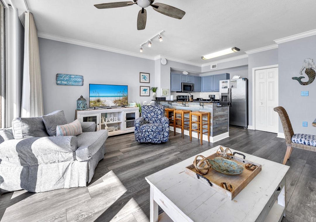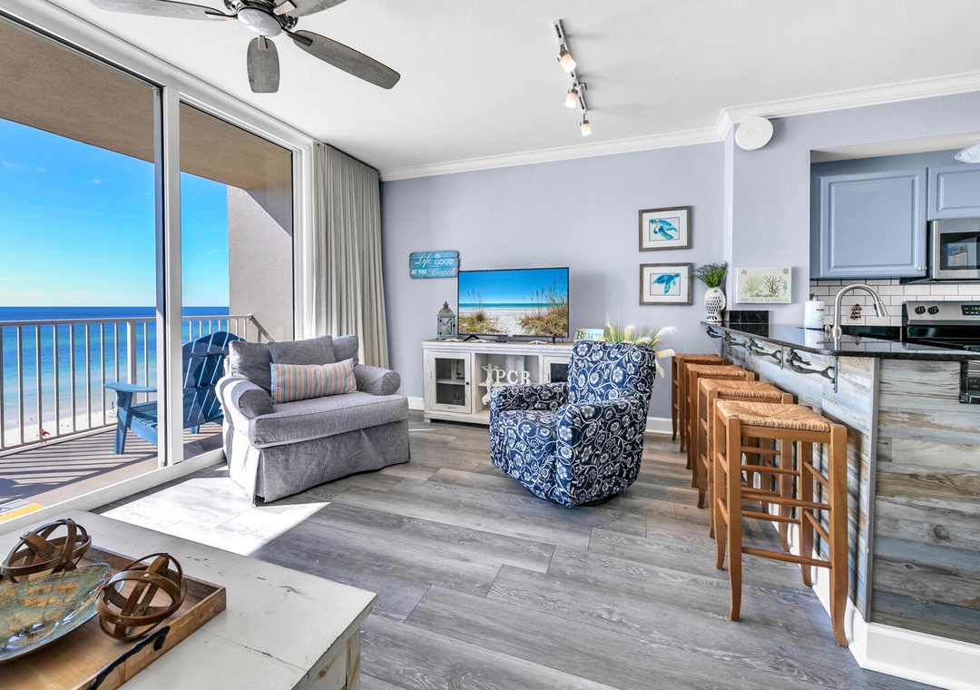 Tidewater 314 offers stunning GULF-FRONT views from this 2-bedroom, 3-bathroom, with a large bunk room. This condo offers 1,131 sq ft that is beautifully furnished with coastal decor throughout. Enjoy this lovely living room designed in coastal chic with fabulous gulf views, It also sports a full kitchen with black granite countertops and an eat-in bar. The master bedroom has a king-size bed and a private bathroom. The guest bedroom has a queen-size bed with a private bathroom. With twin bunks in the bunk room, this condo can accommodate 6 guests comfortably. With all the amenities available at the incredible Tidewater resort, and only being 1 mile away from Pier Park, you're sure to have a dream vacation at Tidewater 314!
