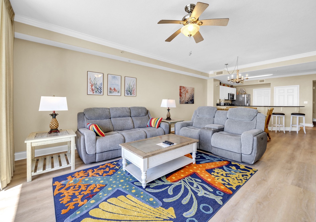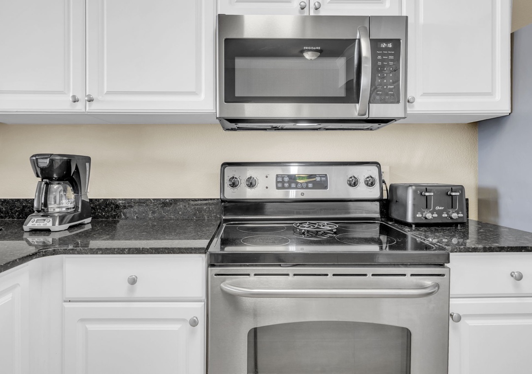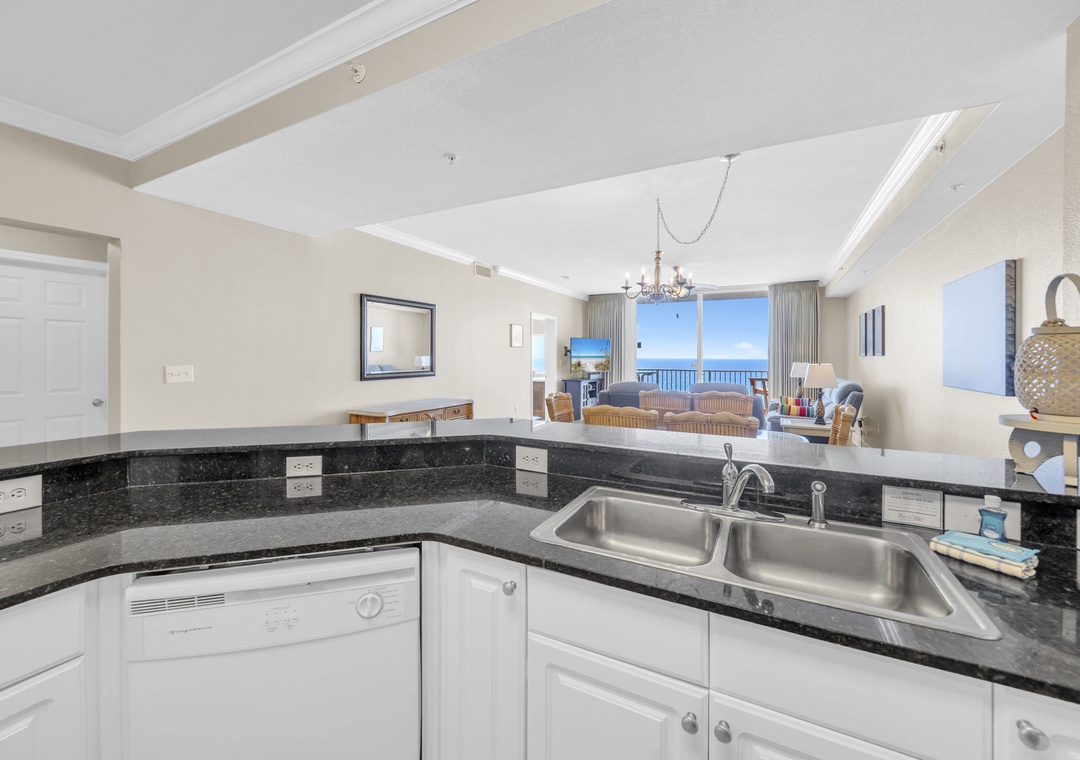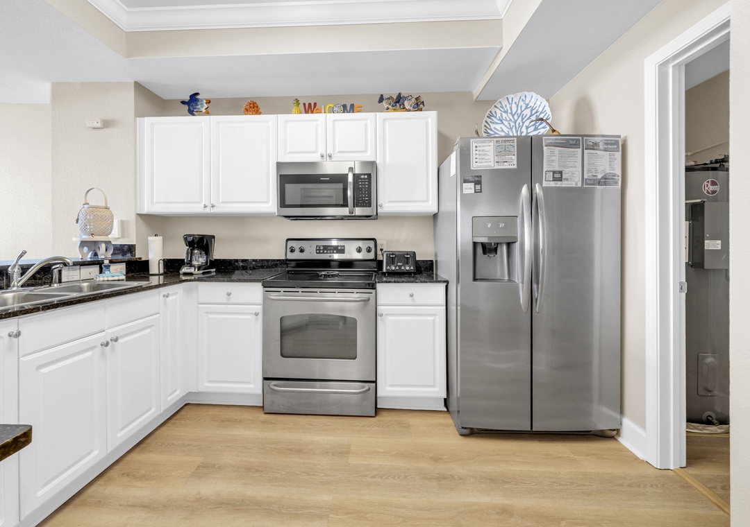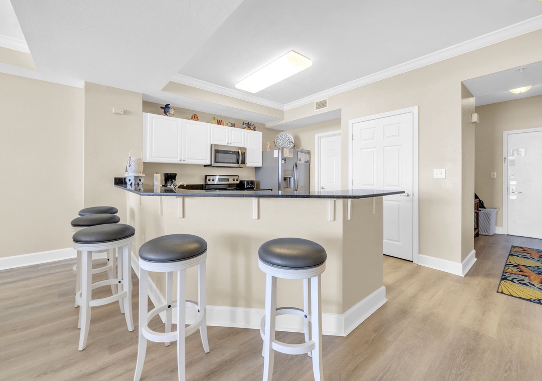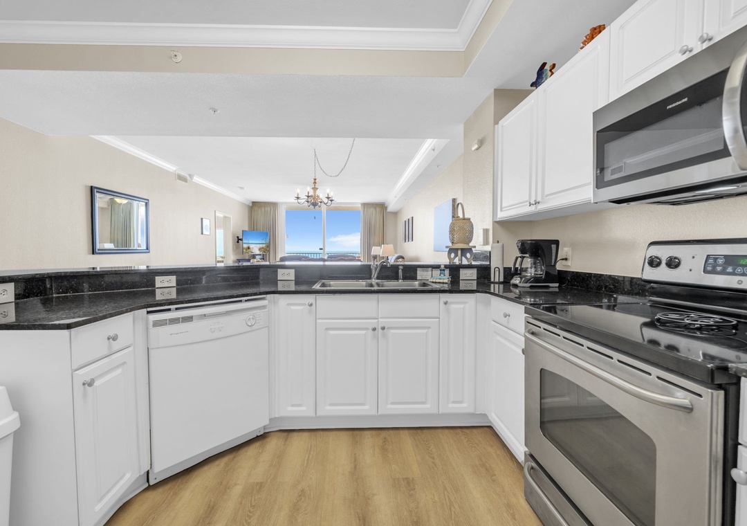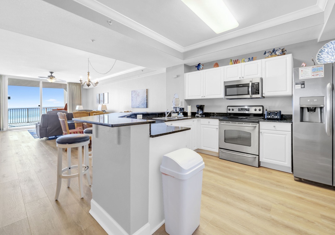 This 4th-floor gem combines stunning views with easy access—minimal elevator waits, maximum relaxation. Inside, brand-new luxury vinyl plank (LVP) flooring flows throughout the spacious living areas, and the open-concept design lets the Gulf view shine from the living room and fully equipped kitchen. Granite countertops, sleek black appliances, and a picture-perfect backdrop make every meal feel like a five-star experience.