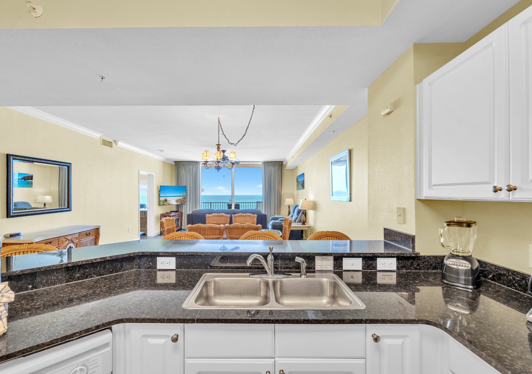 The fully equipped kitchen boasts granite countertops, stainless steel appliances, and panoramic views of the emerald waters—perfect for enjoying meals with a view. The master bedroom offers a luxurious king bed, while the guest bedroom includes two queen beds for added comfort.