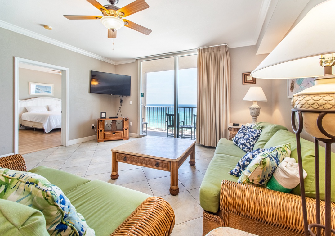Tidewater 502 offers Gulf Front views from the living room, kitchen, balcony, and master bedroom! This spacious 3BA/3BA condo features solid surface flooring throughout and a well equipped kitchen with granite counters and gorgeous views of the Gulf. The beachfront master bedroom has a king bed, sitting area, balcony access, and a private bathroom with a separate soaking tub and a walk-in shower! Additionally, there 's another king bedroom, a bedroom with two full beds, sleeping a total of 8 guests. As an added bonus, all bedrooms and the living room have wall mounted flat screen TVs! With stunning beachfront views, incredible resort amenities, and located under a mile from Pier Park, you're sure to have a perfect vacation at Tidewater 502!