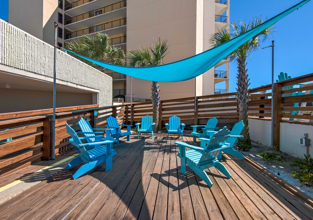 The Top of the Gulf complex's game room boasts a pool table and a foosball table. The pool area features a shuffleboard court that also offers cornhole boards. A large swing and an oversized Adirondack chair add to the beachy atmosphere, and the internet cafe is poolside with dedicated Wi-Fi internet in a shaded space. Top of the Gulf features immaculate landscaping, pristine beachside amenities, and a gorgeous pool (with a kiddie pool) where personal chairs and coolers are welcome. Grills are also provided for personal use. The onsite Surf Snack Shack offers grill items, drinks, smoothies, and other goodies.