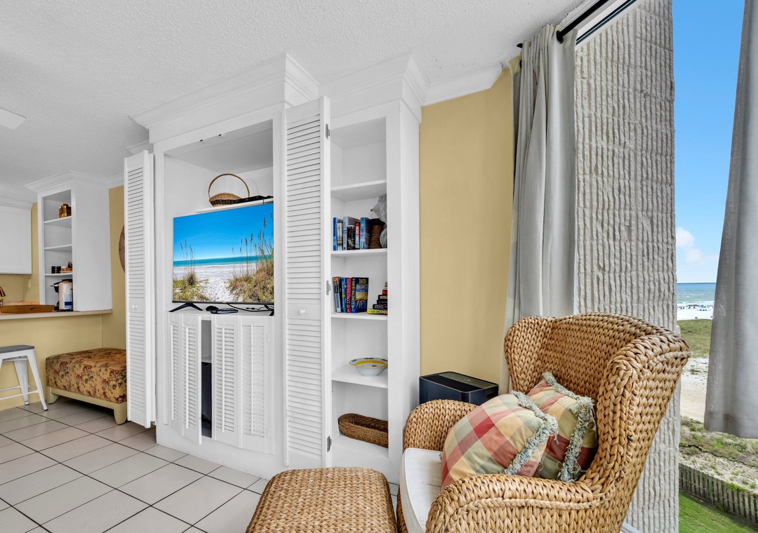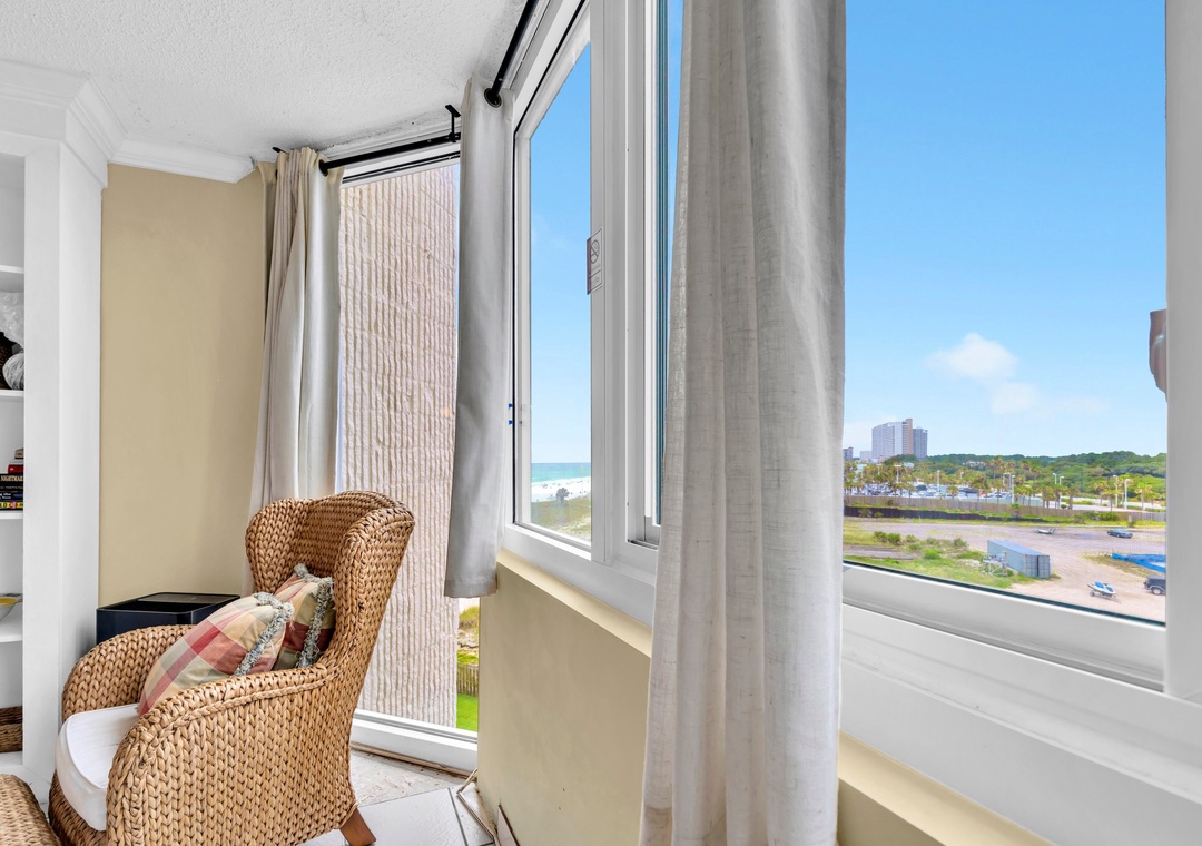 The Top of the Gulf complex's game room boasts a pool table and a foosball table. The pool area features a shuffleboard court that also offers cornhole boards. A large swing and an oversized Adirondack chair add to the beachy atmosphere, and the internet cafe is poolside with dedicated Wi-Fi internet in a shaded space. Top of the Gulf features immaculate landscaping, pristine beachside amenities, and a gorgeous pool (with a kiddie pool) where personal chairs and coolers are welcome. Grills are also provided for personal use. The onsite Surf Snack Shack offers grill items, drinks, smoothies, and other goodies.