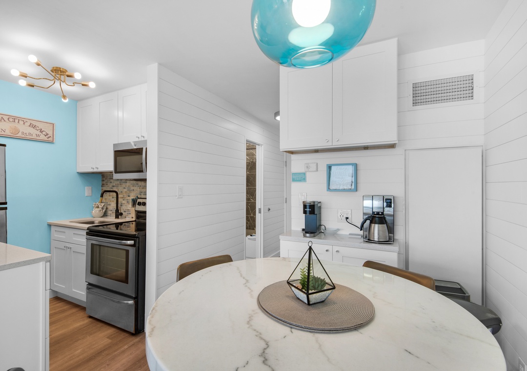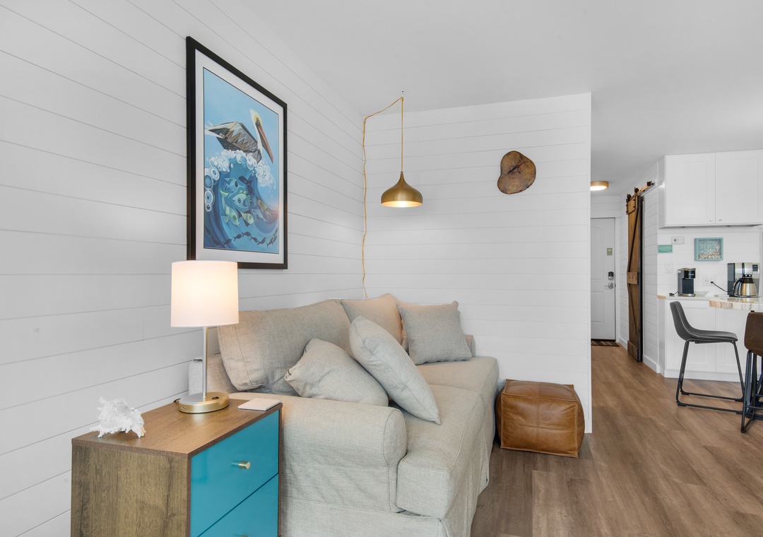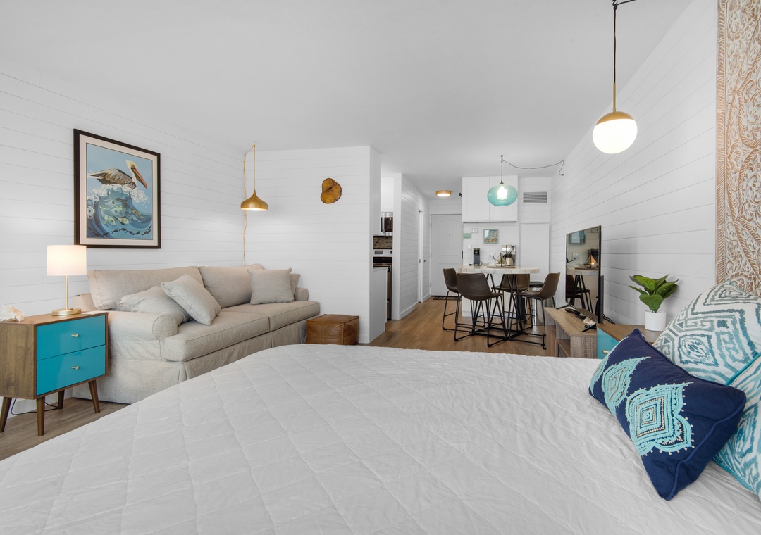 Welcome to Pelican Retreat, this beautifully renovated studio at Top of the Gulf 713 is perfect for a small family getaway, a romantic retreat for two, or even a solo journey to relax and recharge. Unwind on the California king bed and new queen sleeper sofa to sleep up to 4 guests. A fully equipped kitchen with new cabinets and quartz counter-tops, a coffee bar, Smart TV, WiFi, a full bath, and a closet with plenty of organization will make you want to extend your stay. This condo looks directly out over the beach and community pool, and you can open the large picture window to hear the waves! Walk to the stunning white sand beach, hang out at the pool, or enjoy one of several cozy places to kick back, unwind, and enjoy the view of the ocean from this 7th-floor condo. Come visit Pelican Retreat for your next getaway!