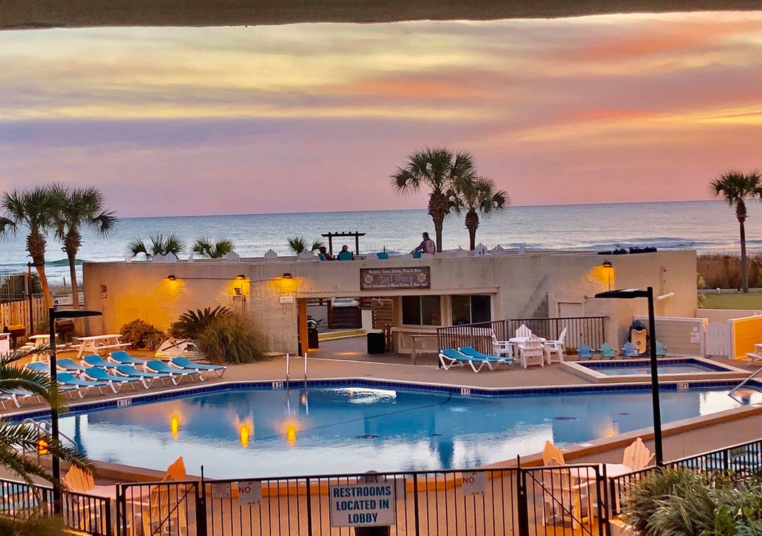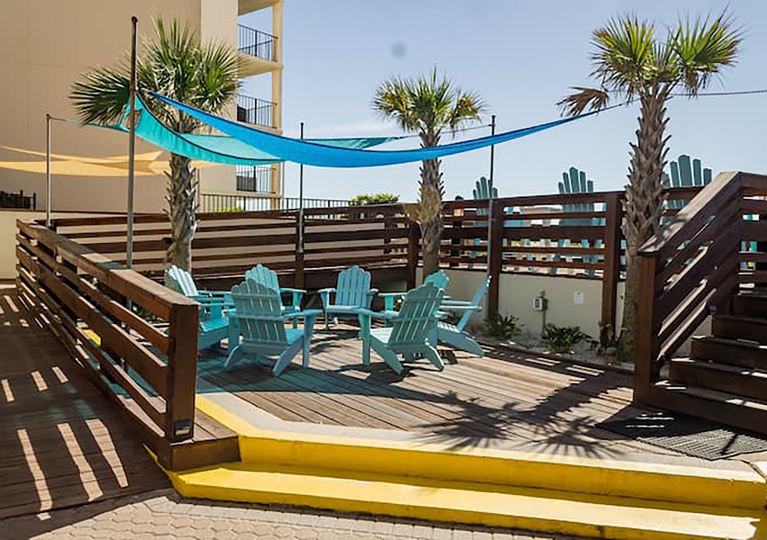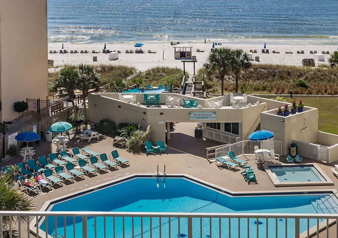 The Top of the Gulf complex's game room boasts a pool table and a foosball table. The pool area features a shuffleboard court that also offers cornhole boards. A large swing and an oversized Adirondack chair add to the beachy atmosphere, and the internet cafe is poolside with dedicated Wi-Fi internet in a shaded space. Top of the Gulf features immaculate landscaping, pristine beachside amenities, and a gorgeous pool (with a kiddie pool) where personal chairs and coolers are welcome. Grills are also provided for personal use. The onsite Surf Snack Shack offers grill items, drinks, smoothies, and other goodies.