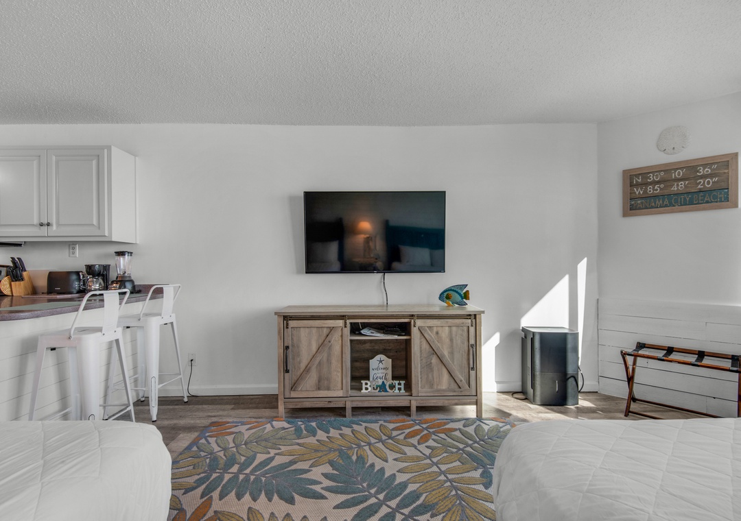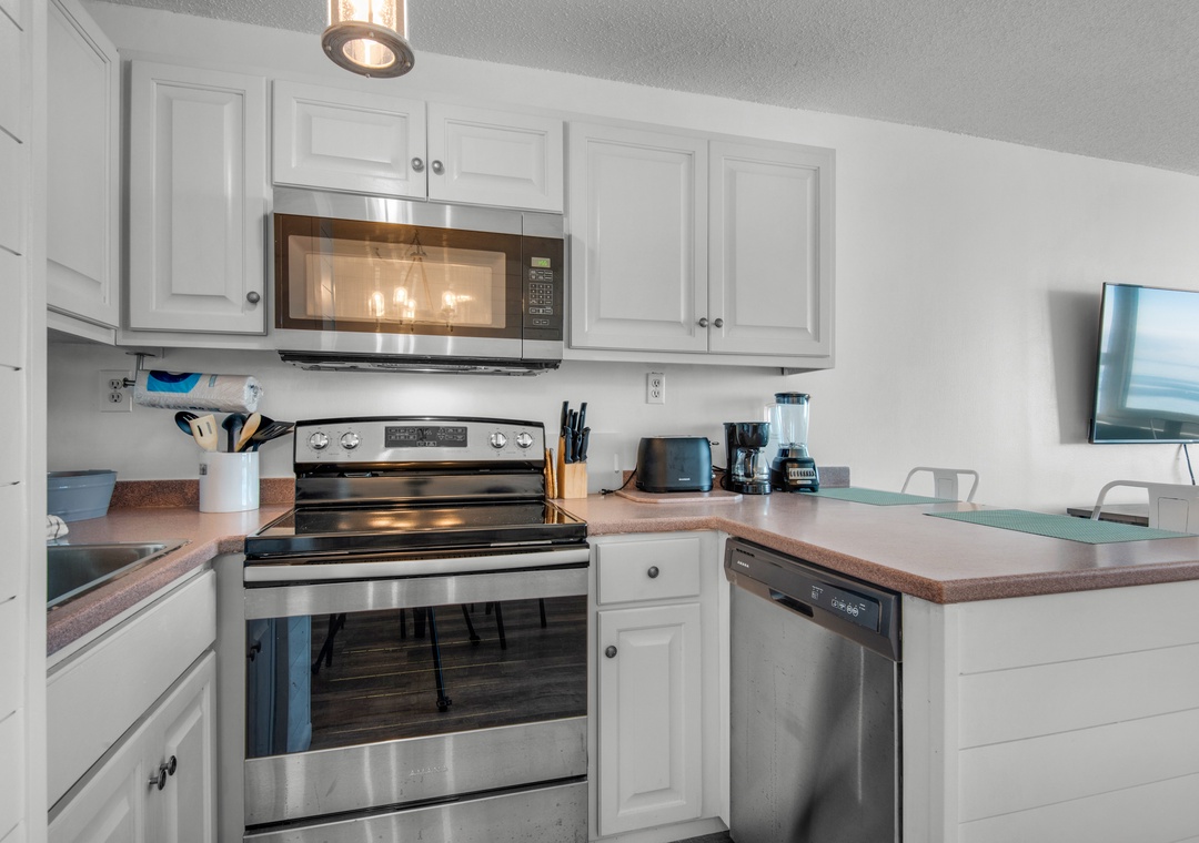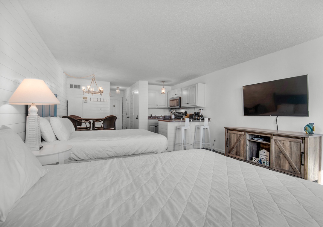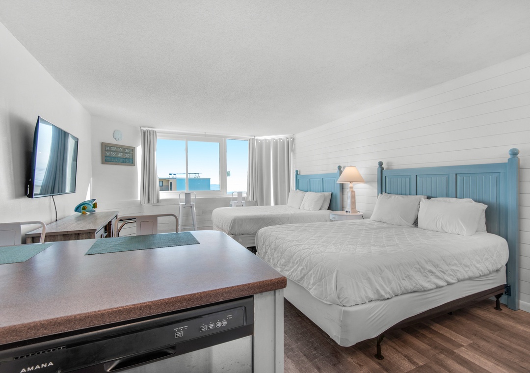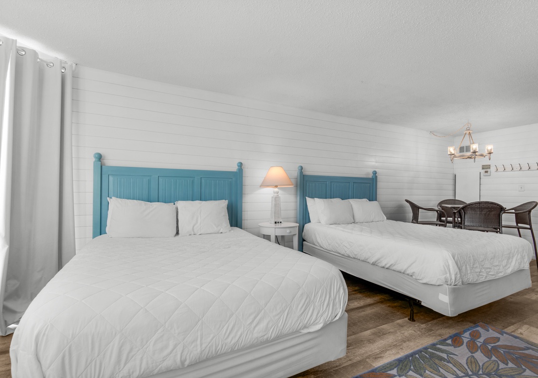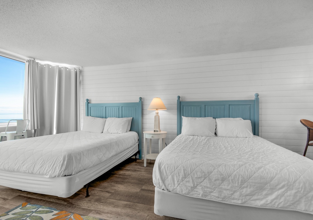Top of the Gulf 807 is a cozy and totally renovated studio that has large windows overlooking the pool and the Gulf of Mexico. Offering two comfortable queen beds to sleep up to 4 guests, this is a perfect space for couples or small families. The open kitchen has everything you need to whip up an amazing meal with plenty of counter space for meal prep. A dining table is available to enjoy your delectable meal or as a laptop-friendly area while you work remotely. Your next family vacation is waiting, and Top of the Gulf 807 will have you ready to come back year after year to make memories on the Gulf Coast.