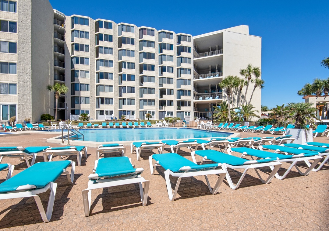 The Top of the Gulf complex's game room boasts a pool and a foosball table. The pool area features a shuffleboard court that also offers cornhole boards. A large swing and an oversized Adirondack chair add to the beachy atmosphere, and the internet cafe is poolside with dedicated Wi-Fi internet in a shaded space. Top of the Gulf features immaculate landscaping, pristine beachside amenities, and a gorgeous pool, (with a kiddie pool) where personal chairs and coolers are welcome. Grills are also provided for personal use. The onsite Surf Snack Shack offers grill items, drinks, smoothies, and other goodies.