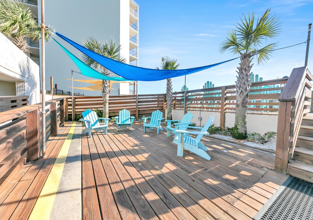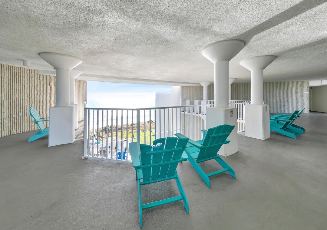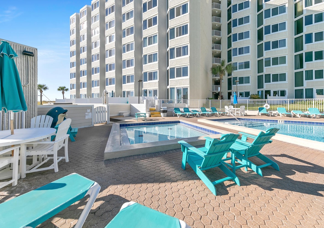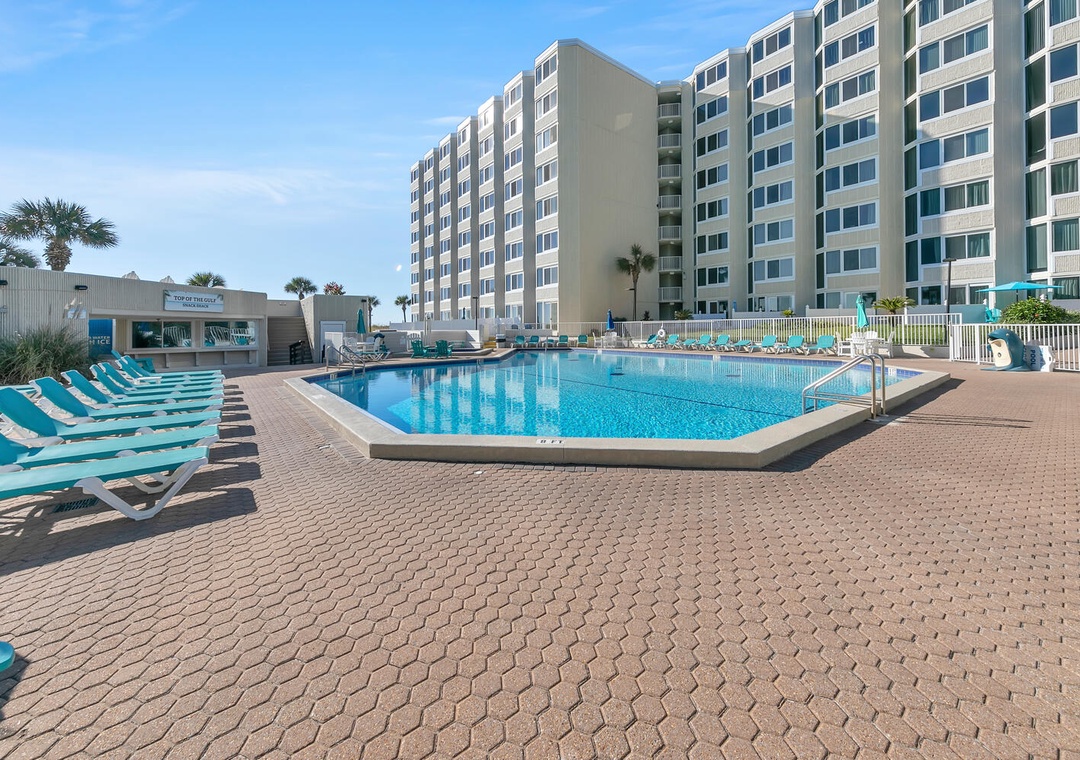 The Top of the Gulf complex's game room boasts a pool and a foosball table. The pool area features a shuffleboard court that also offers cornhole boards. A large swing and an oversized Adirondack chair add to the beachy atmosphere, and the internet cafe is poolside with dedicated Wi-Fi internet in a shaded space. Top of the Gulf features immaculate landscaping, pristine beachside amenities, and a gorgeous pool, (with a kiddie pool) where personal chairs and coolers are welcome. Grills are also provided for personal use. The onsite Surf Snack Shack offers grill items, drinks, smoothies, and other goodies.