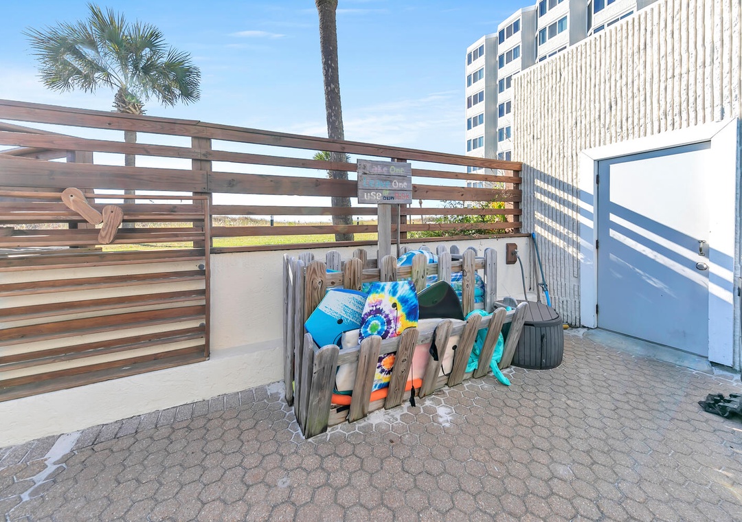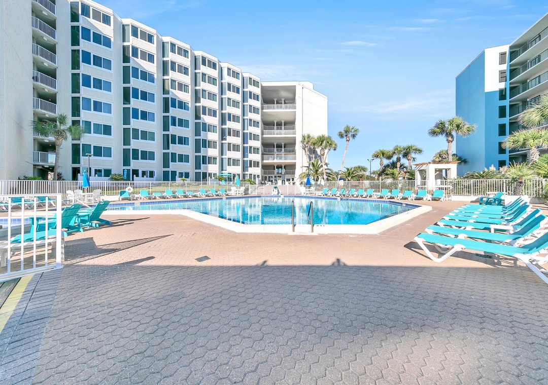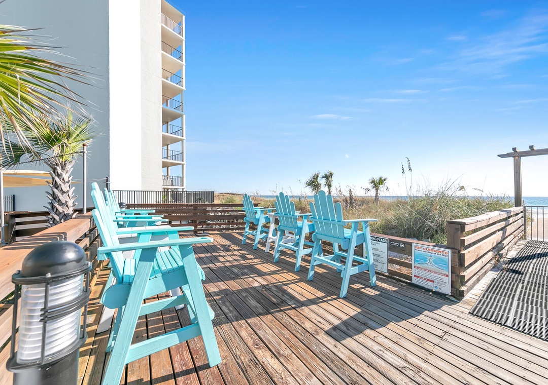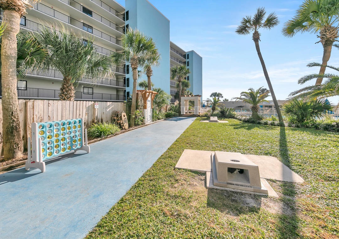 The Top of the Gulf complex's game room boasts a pool and a foosball table. The pool area features a shuffleboard court that also offers cornhole boards. A large swing and an oversized Adirondack chair add to the beachy atmosphere, and the internet cafe is poolside with dedicated Wi-Fi internet in a shaded space. Top of the Gulf features immaculate landscaping, pristine beachside amenities, and a gorgeous pool, (with a kiddie pool) where personal chairs and coolers are welcome. Grills are also provided for personal use. The onsite Surf Snack Shack offers grill items, drinks, smoothies, and other goodies.