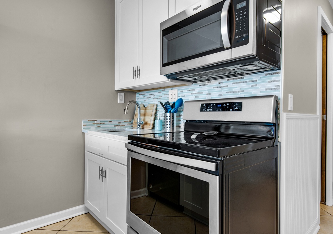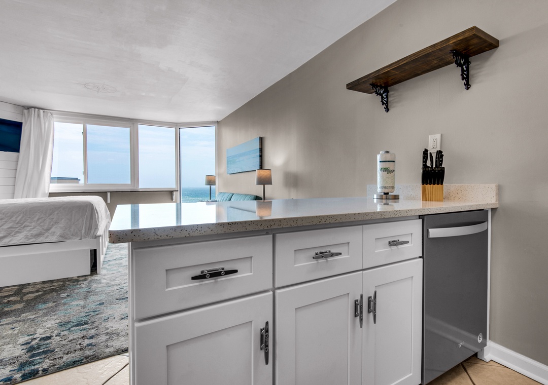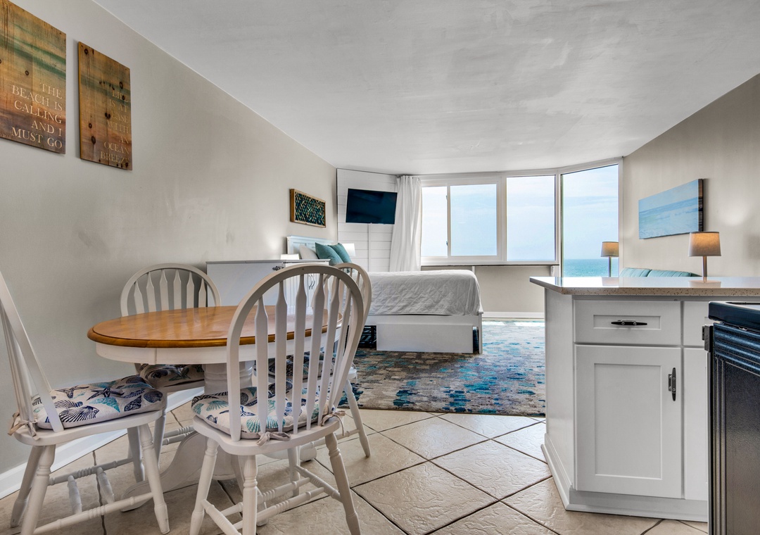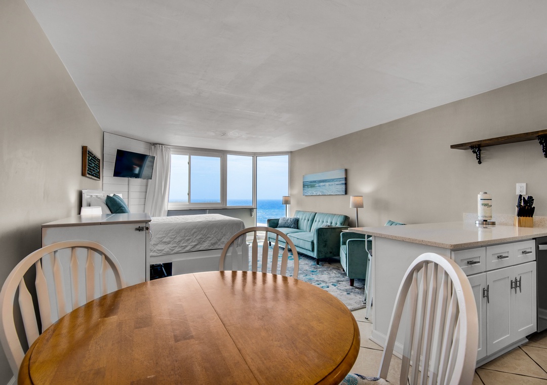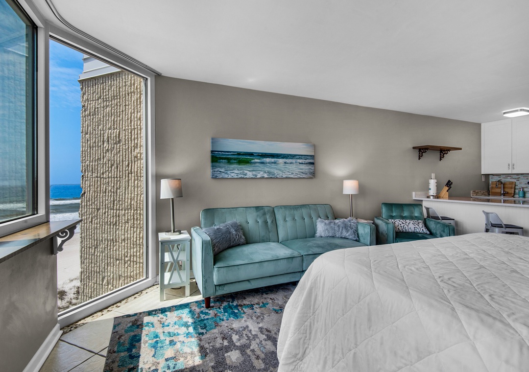 Welcome to Whimsical Waves, this beautifully renovated studio at Top of the Gulf 813 is perfect for a romantic retreat for two, or even a solo journey to relax and recharge. Unwind on the Queen bed, which sleeps 2 guests. A fully equipped kitchen with new cabinets and quartz countertops, coffee bar, Smart TV, WiFi, and full bath. This condo looks out over the beach and community pool. Walk to the stunning white sand beach, hang out at the pool, or enjoy one of several cozy places to kick back, unwind, and enjoy the view of the ocean from this 8th-floor condo. Come visit Whimsical Waves for your next getaway!
