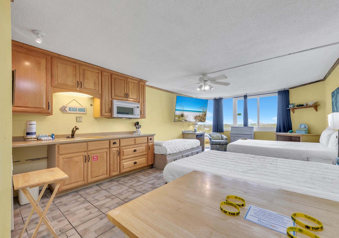 Escape to Top of the Gulf 822 and enjoy everything the Gulf Coast has to offer. This cozy studio has stunning Gulf views from a large window and a fully equipped kitchen. There are 2 Queen beds to allow up to 4 guests to sleep comfortably. Wake up to the sun each morning, as it sparkles off the emerald green waters of the Gulf through large windows. While you are not in the condo, venture around the complex to find the game room, shuffleboard, cornhole, large Adirondack chairs to relax in, and a small café. Make lasting memories at Top of the Gulf 822 today.