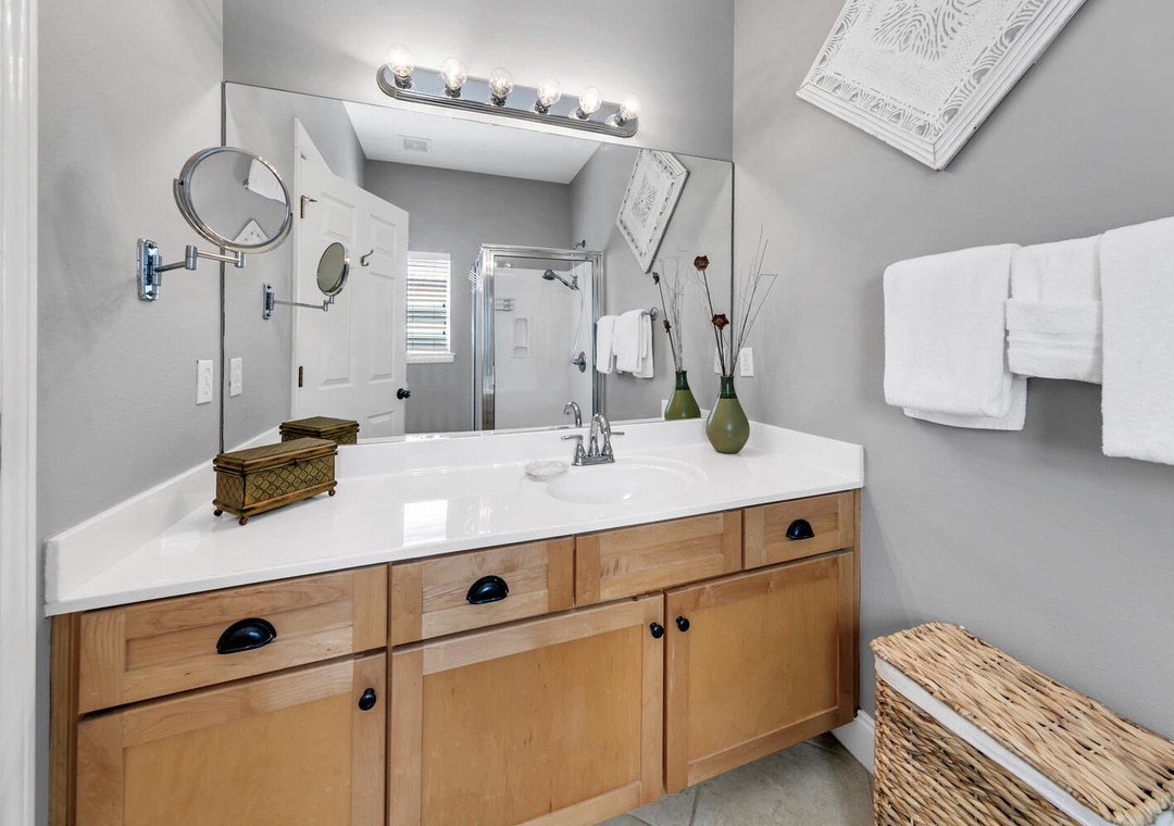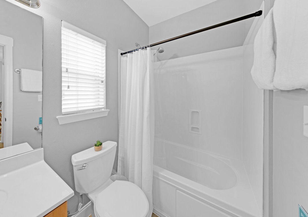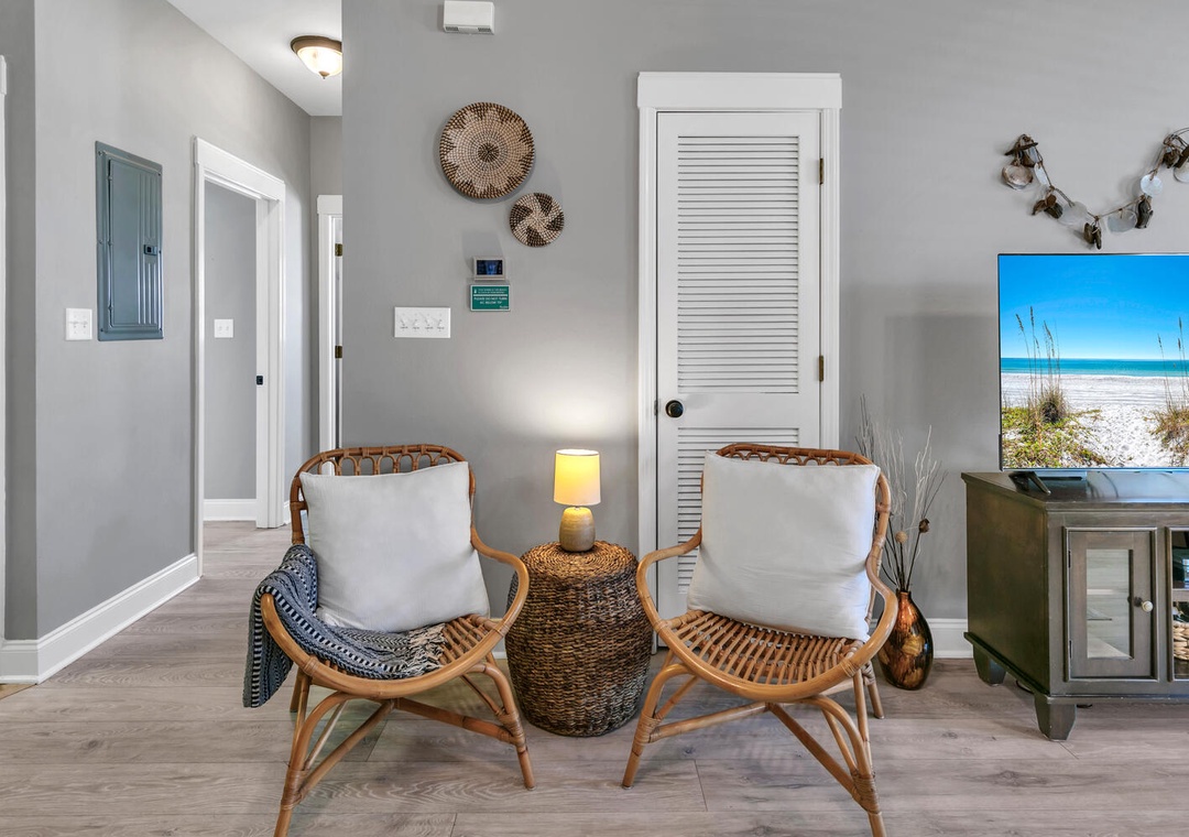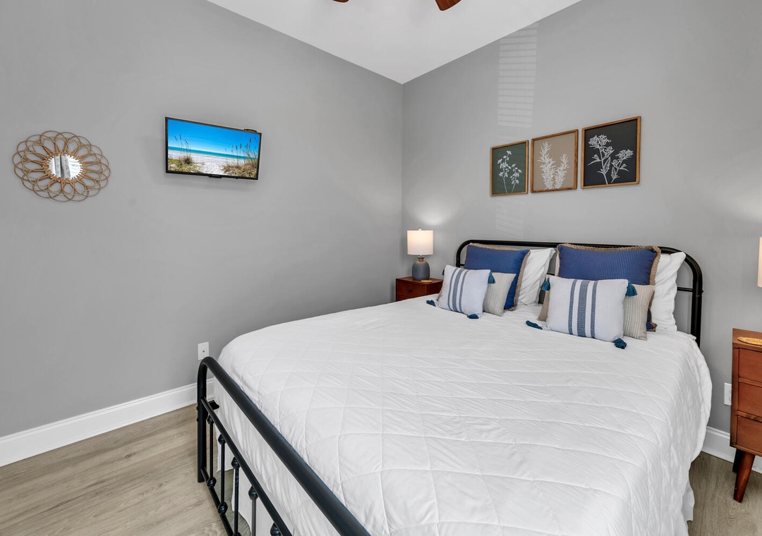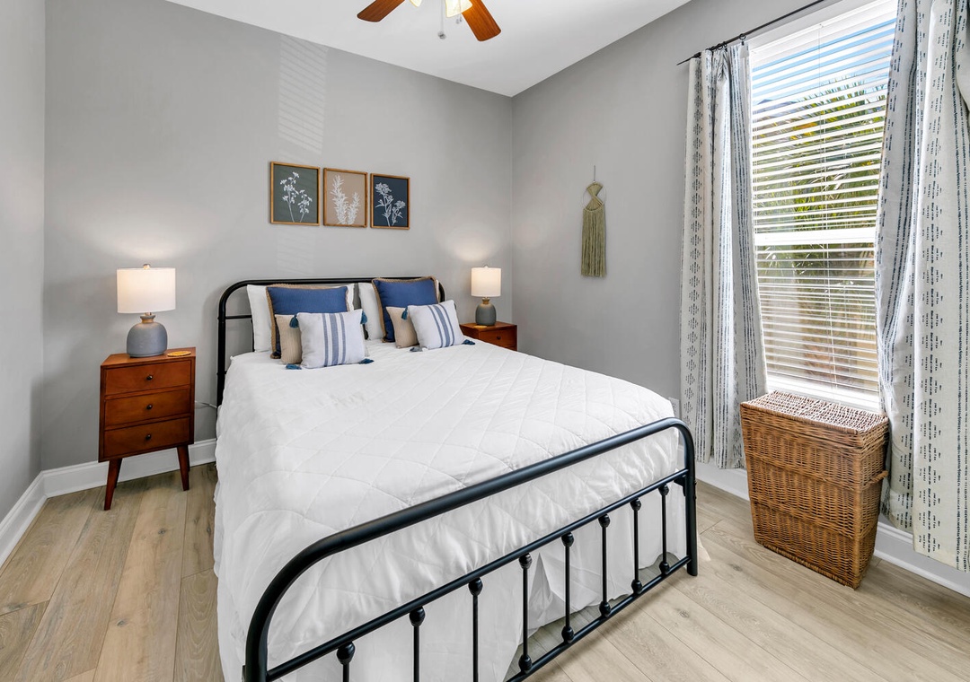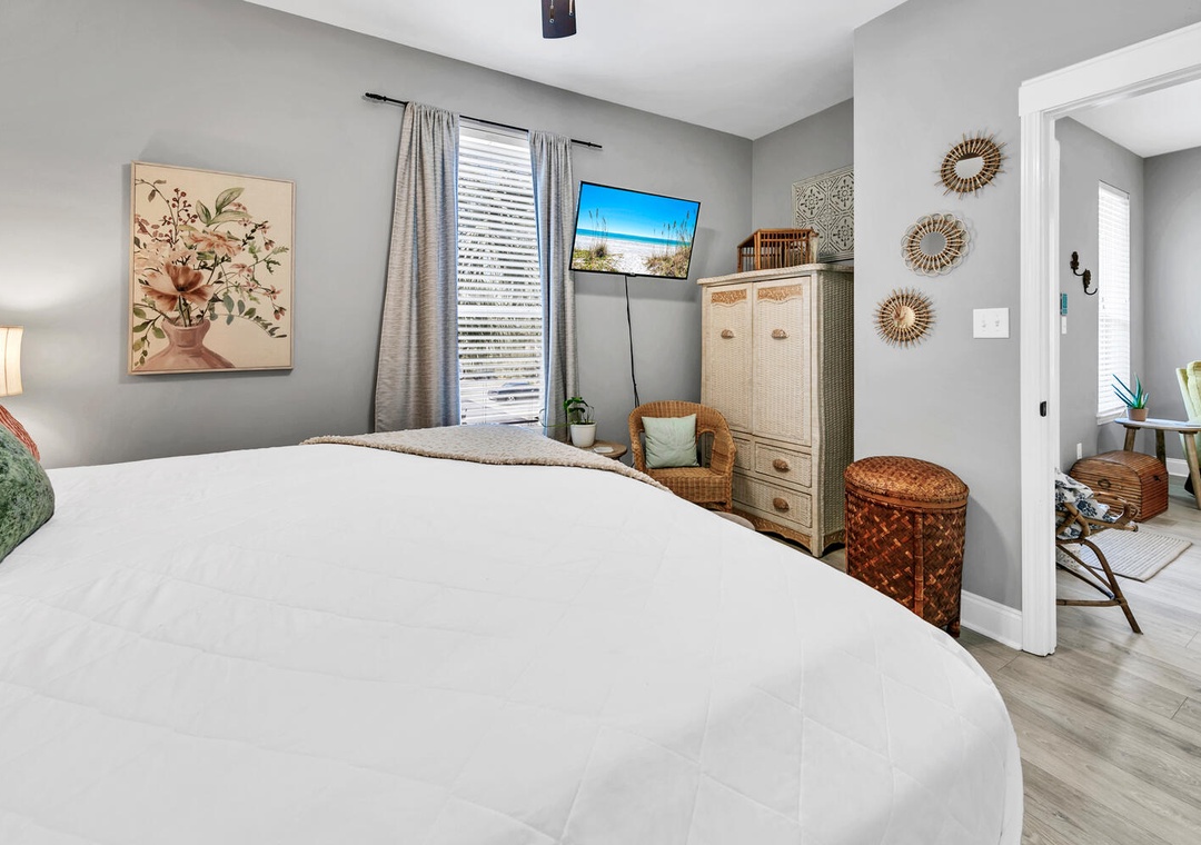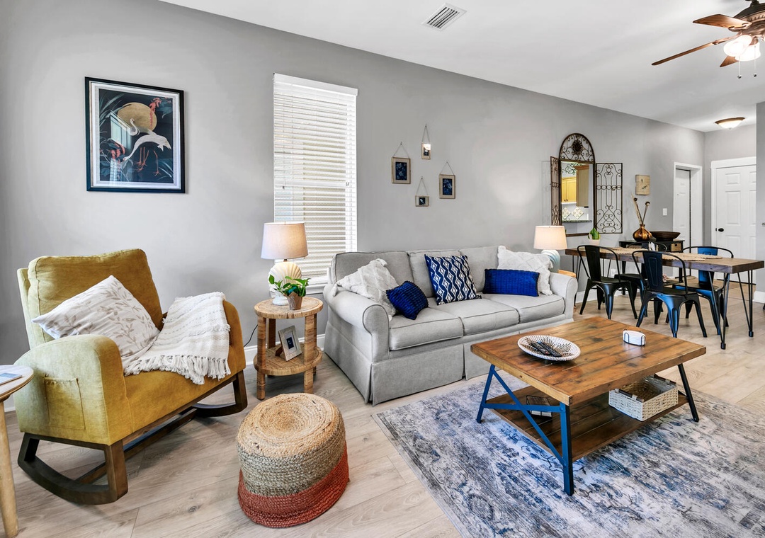 The cozy, comfortable king bed in the master suite has an attached private bathroom, and the updated guest room has a queen-sized bed with peaceful coastal botanical decor offering a tranquil atmosphere to ensure a comfy & relaxing space to rest anytime, day or night! The guest room also features a flexible workspace with a folding desk for your convenience, making it easy to catch up on work or enjoy a quiet moment. The folding desk can be easily stored in the closet when not in use. There is also a sofa bed in the living room for extra sleeping space. You will want to return time and time again to Shore Bird Sanctuary!