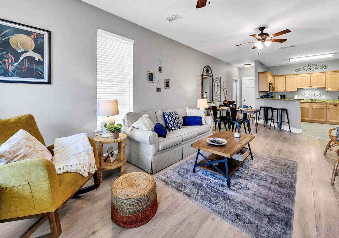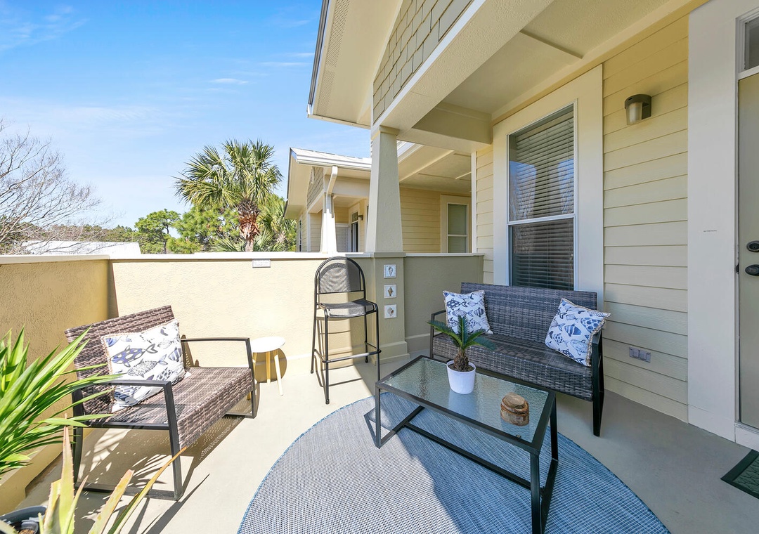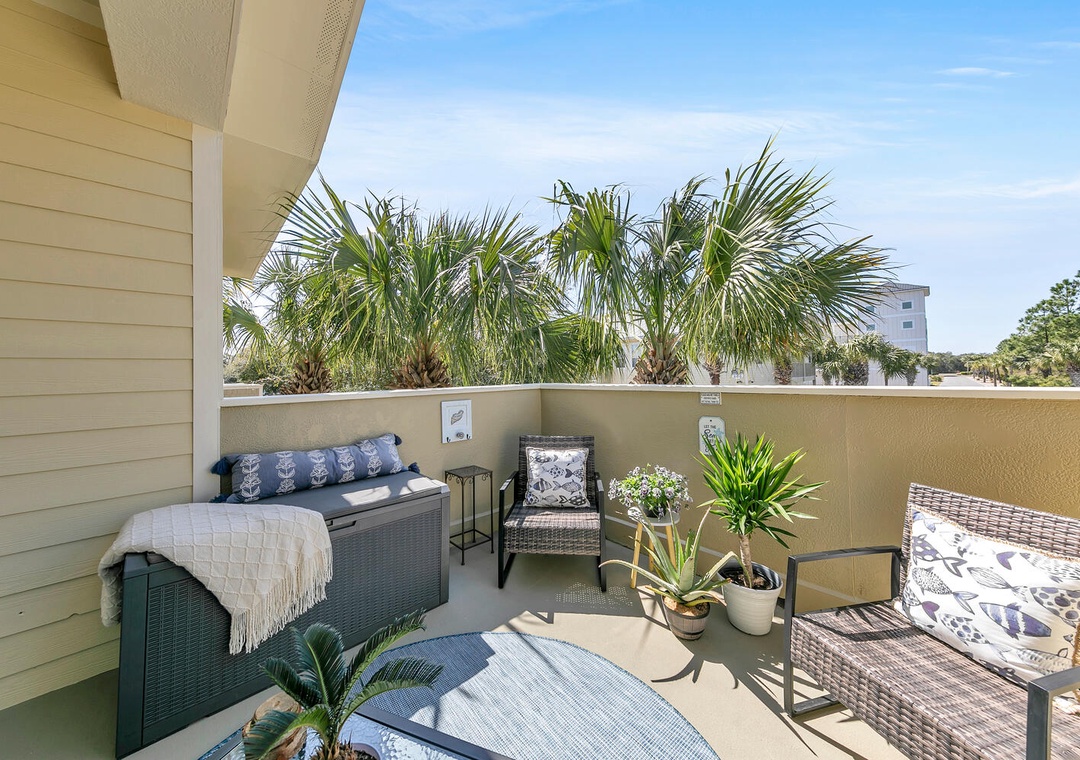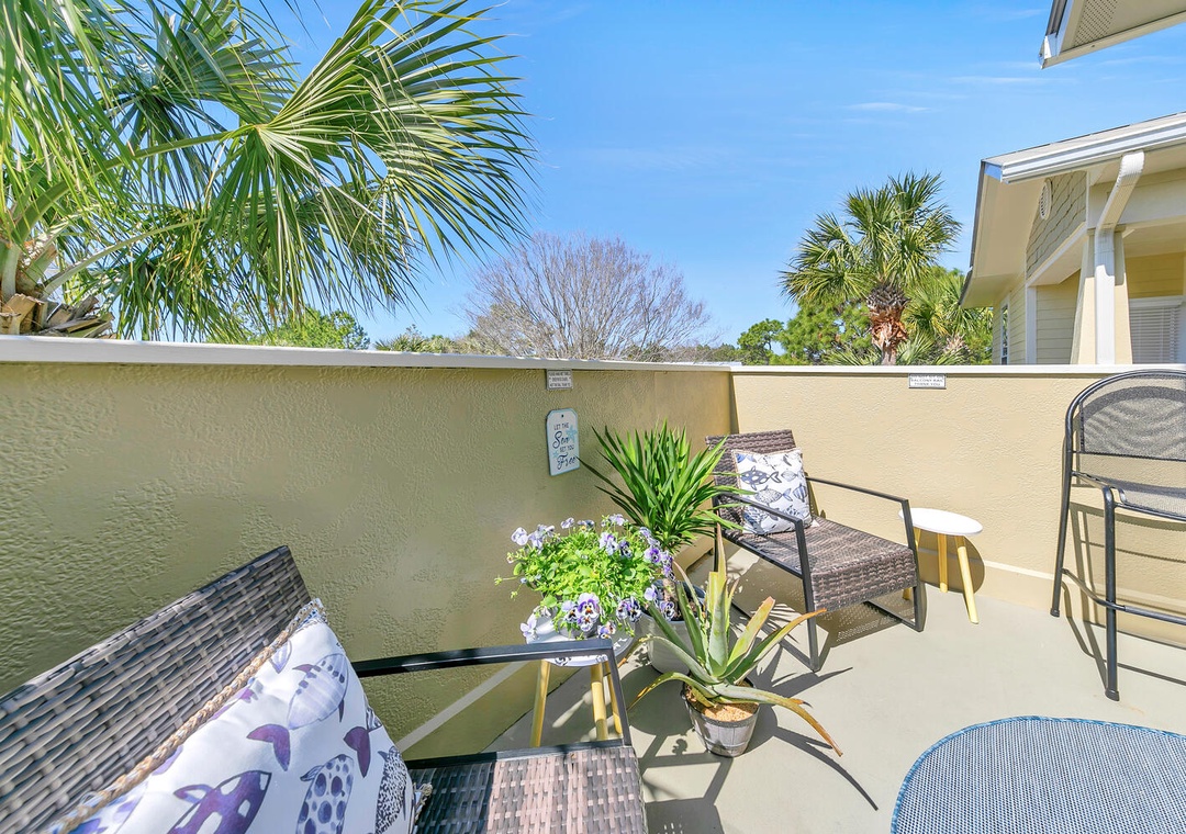 Welcome to Shore Bird Sanctuary, a casual, yet chic 2-bedroom, 2-bathroom condo. This professionally managed Santa Rosa Beach retreat is located in Topsail Village on the west end of 30A. Start your morning by relaxing on the large, private balcony with your favorite cup of coffee as you enjoy the peaceful view of the palm trees overlooking the balcony. This bright and naturally sunlit condo makes a great vacation stay for singles, couples, families, or those looking to celebrate a special occasion. The west end of 30A is distinctly quieter, but it is still incredibly convenient to all the finest area attractions. Shore Bird Sanctuary is equipped with everything you need for your vacation. The open kitchen has all the utensils, plates, and cookware you’ll need to prepare a meal for your family or that romantic dinner. We supply both a Keurig and a drip coffee pot for your convenience.